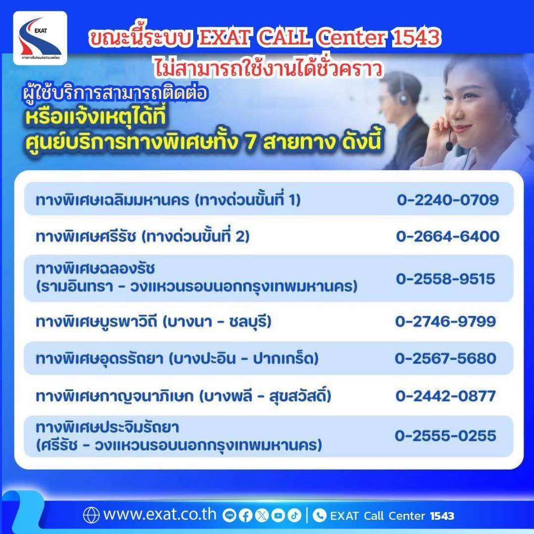 การทางพิเศษแห่งประเทศไทย (กทพ.) ขอเเจ้งผู้ใช้บริการทางพิเศษทุกท่าน ทราบว่า ขณะนี้ ระบบ Exat Call Center 1543 ขัดข้อง ไม่สามารถให้บริการได้