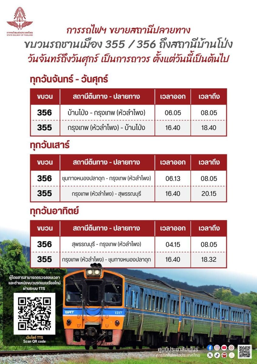 การรถไฟแห่งประเทศไทย (รฟท.) ยกระดับการให้บริการรถไฟชานเมือง เดินหน้าขยายปลายทางขบวนรถชานเมืองที่ 355/356 จากเดิมเส้นทางกรุงเทพ(หัวลำโพง) – ชุมทางหนองปลาดุก – กรุงเทพ(หัวลำโพง) เป็นกรุงเทพ(หัวลำโพง) – บ้านโป่ง – กรุงเทพ(หัวลำโพง) เฉพาะวันจันทร์ถึงวันศุกร์ เป็นการถาวร ตั้งแต่บัดนี้เป็นต้นไป เพื่อรองรับความต้องการเดินทางของประชาชนในช่วงชั่วโมงเร่งด่วน ได้อย่างมีประสิทธิภาพมากยิ่งขึ้น