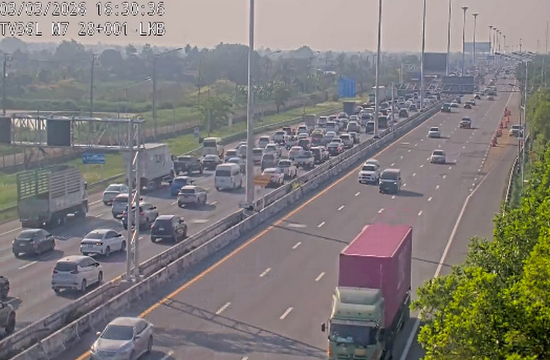 3 มีนาคม 2569 เวลานี้ 16.28 น. การจราจร ถนนมอเตอร์เวย์ ทล.7 ขาเข้า กทม ที่ด่านลาดกระบัง การจราจรหนาแน่น ปชช.-นักท่องเที่ยว เดินทางกลับจากทำบุญไหว้พระ และท่องเที่ยวเยอะ ส่งผลให้ปริมาณจราจร มอเตอร์เวย์ ทล.7 ตรงด่านลาดกระบัง ติดสะสมกว่า 5 กิโลเมตร พ้นหน้าด่านแล้วดีขึ้น