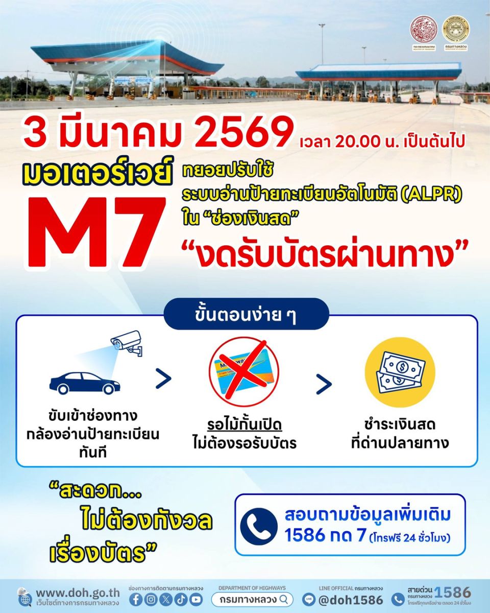 โดยกรมทางหลวงจะทยอยปรับใช้ระบบ ALPR จนครบทุกด่านของมอเตอร์เวย์สาย 7 (M7) ภายในกลางเดือนมีนาคม 2569 นี้ สะดวก ไม่ต้องกังวลเรื่องบัตร หากมีข้อสงสัยหรือต้องการสอบถามข้อมูลเพิ่มเติม สามารถติดต่อสายด่วนกรมทางหลวง 1586 กด 7 (โทรฟรีตลอด 24 ชั่วโมง)
