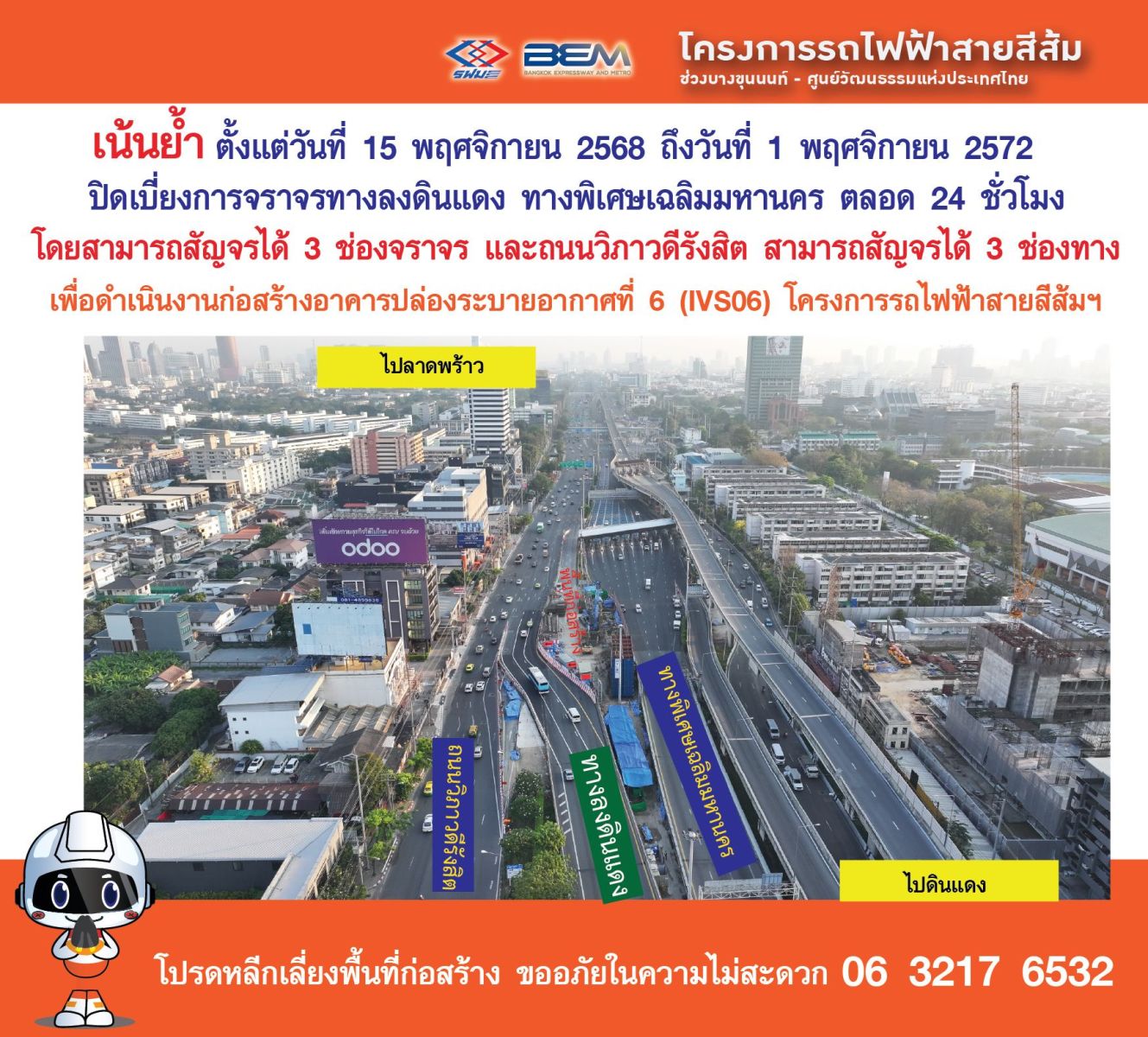 พร้อมเน้นย้ำ ปิดเบี่ยงการจราจรทางลงดินแดง ทางพิเศษเฉลิมมหานคร ตั้งแต่วันที่ 15 พฤศจิกายน 2568 ถึงวันที่ 1 พฤศจิกายน 2572 ปิดเบี่ยงการจราจรทางลงดินแดง ทางพิเศษเฉลิมมหานคร ตลอด 24 ชั่วโมง โดยสามารถสัญจรได้ 3 ช่องจราจร และถนนวิภาวดีรังสิต สามารถสัญจรได้ 3 ช่องทาง เพื่อดำเนินงานก่อสร้างอาคารปล่องระบายอากาศที่ 6 (IVS06)
