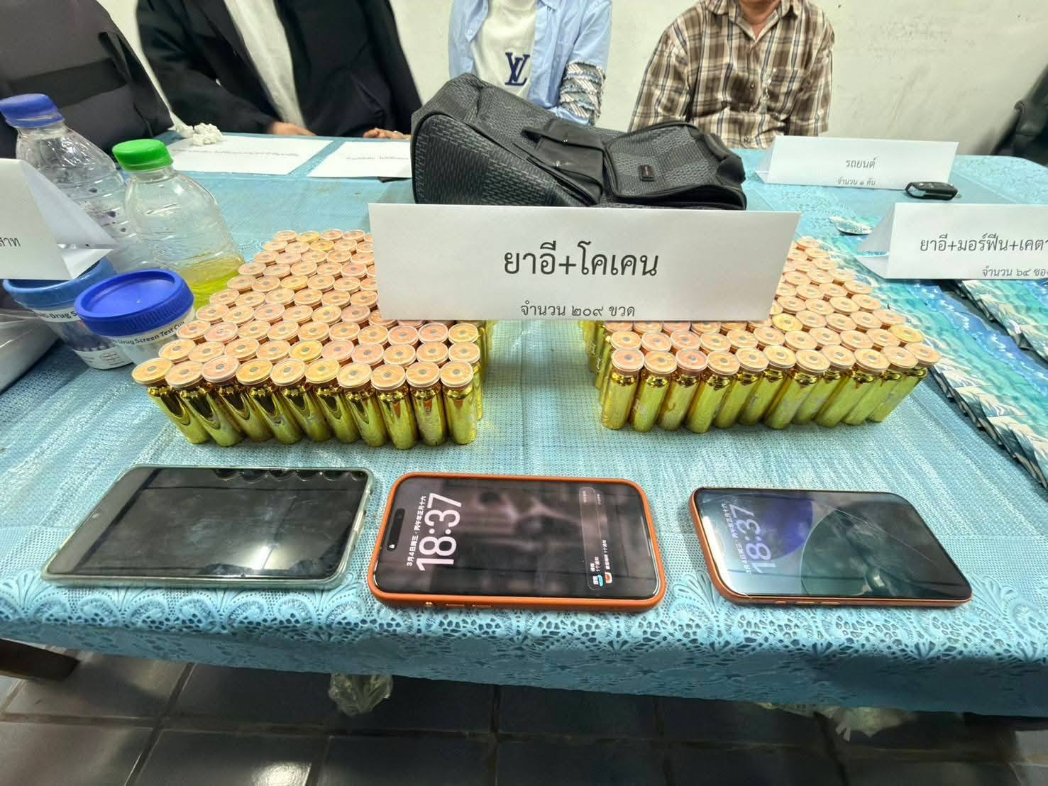 เมื่อตรวจสอบพบคนขับชื่อนายพอ (นามสมมุติ) อายุ 70 ปี ภายในรถพบชายชาวจีน2 คน เจ้าหน้าที่ได้ขอดูหนังสือเดินทาง แต่ไม่พบเอกสารการเดินทาง เมื่อตรวจสอบภายในรถอย่างละเอียด และในกระเป๋าเดินทาง พบขวดสีทองมีตัวอักษรภาษาอังกฤษ จำนวน 209 ขวด โดยทราบว่าเป็นยาเสียสาว