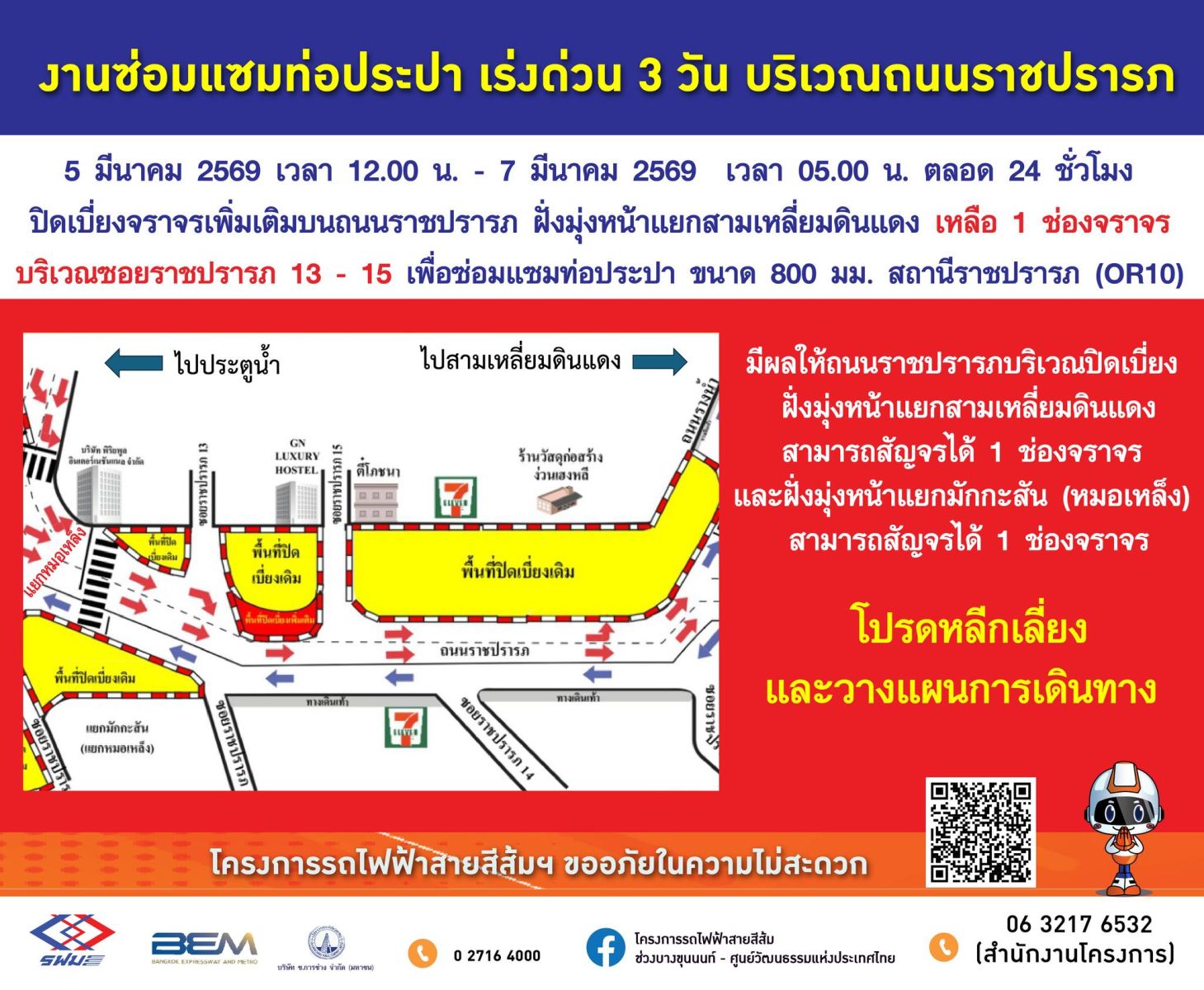 5 มีนาคม 2569 สมาชิกแจ้งรายงานผ่านแฟนเพจ เส้นทางจากหน้าเซ็นทรัลเวิล์ด ถ.ราชดำริ ตรงผ่านแยกประตูน้ำ ถ.ราชปรารภ ไปดินแดง บ่ายนี้รถติดขัด เนื่องจากช่วงแยกมักกะสัน ราชปรารภ 15-13 มีเบี่ยงช่องจราจร โดยข้อมูลเพิ่มเติมจาก โครงการรถไฟฟ้าสายสีส้ม ช่วงบางขุนนนท์ - ศูนย์วัฒนธรรมแห่งประเทศไทย แจ้งประชาสัมพันธ์ งานซ่อมแซมท่อประปา กรณีเร่งด่วน 3 วัน บริเวณถนนราชปรารภ ตั้งแต่วันที่ 5 มีนาคม 2569 เวลา 12.00 น. - 7 มีนาคม 2569 เวลา 05.00 น. ตลอด 24 ชั่วโมง ปิดเบี่ยงจราจรเพิ่มเติมบนถนนราชปรารภ ฝั่งมุ่งหน้าแยกสามเหลี่ยมดินแดง เหลือ 1 ช่องจราจร บริเวณซอยราชปรารภ 13 - 15 เพื่อซ่อมแซมท่อประปา ขนาด 800 มม. สถานีราชปรารภ (OR10)