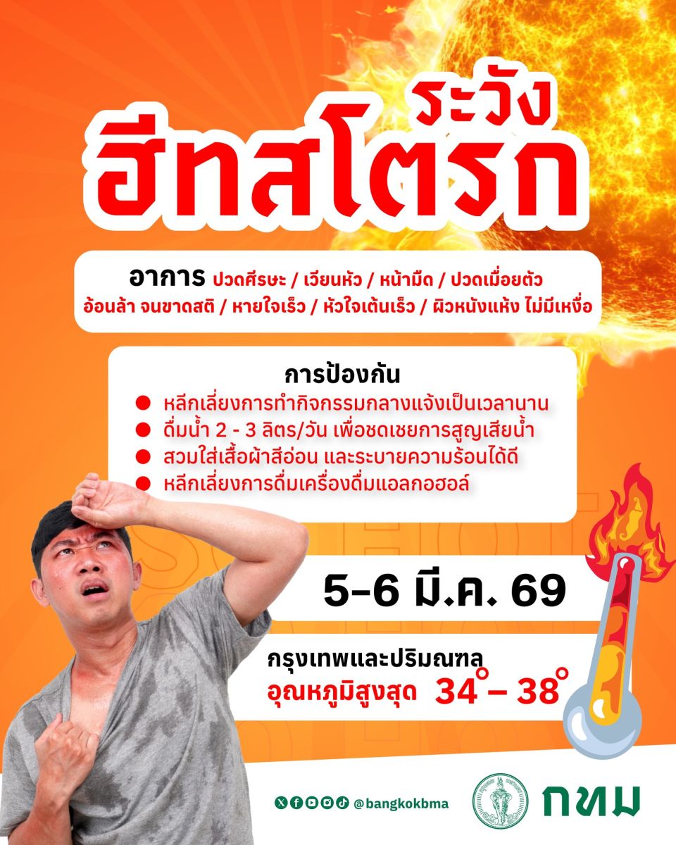 วันที่ 5 มีนาคม 2569 เฟซบุ๊ก กรุงเทพมหานคร โพสต์ข้อความโดยระบุว่า เตือนระวังฮีทสโตรก ช่วงนี้อากาศร้อนมากโปรดดูแลสุขภาพ 5-6 มี.ค. 69 อุณหภูมิกรุงเทพฯ สูงสุด 34 - 38 องศาฯ