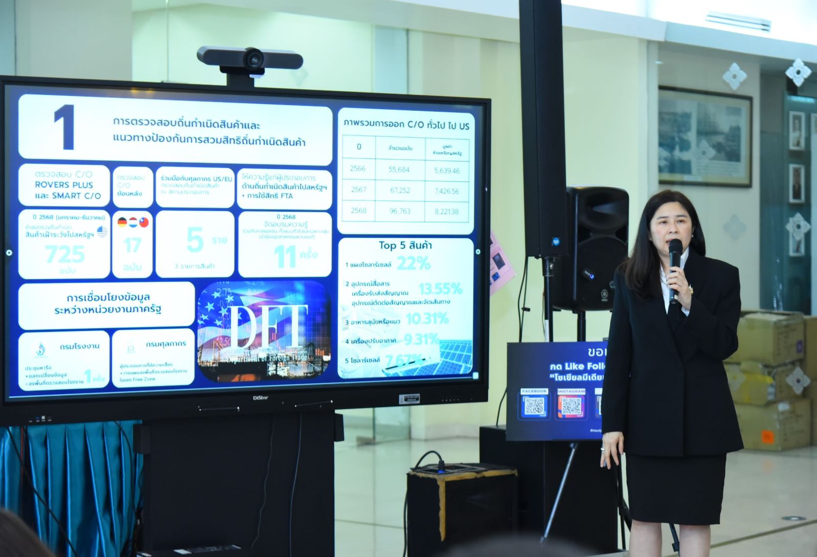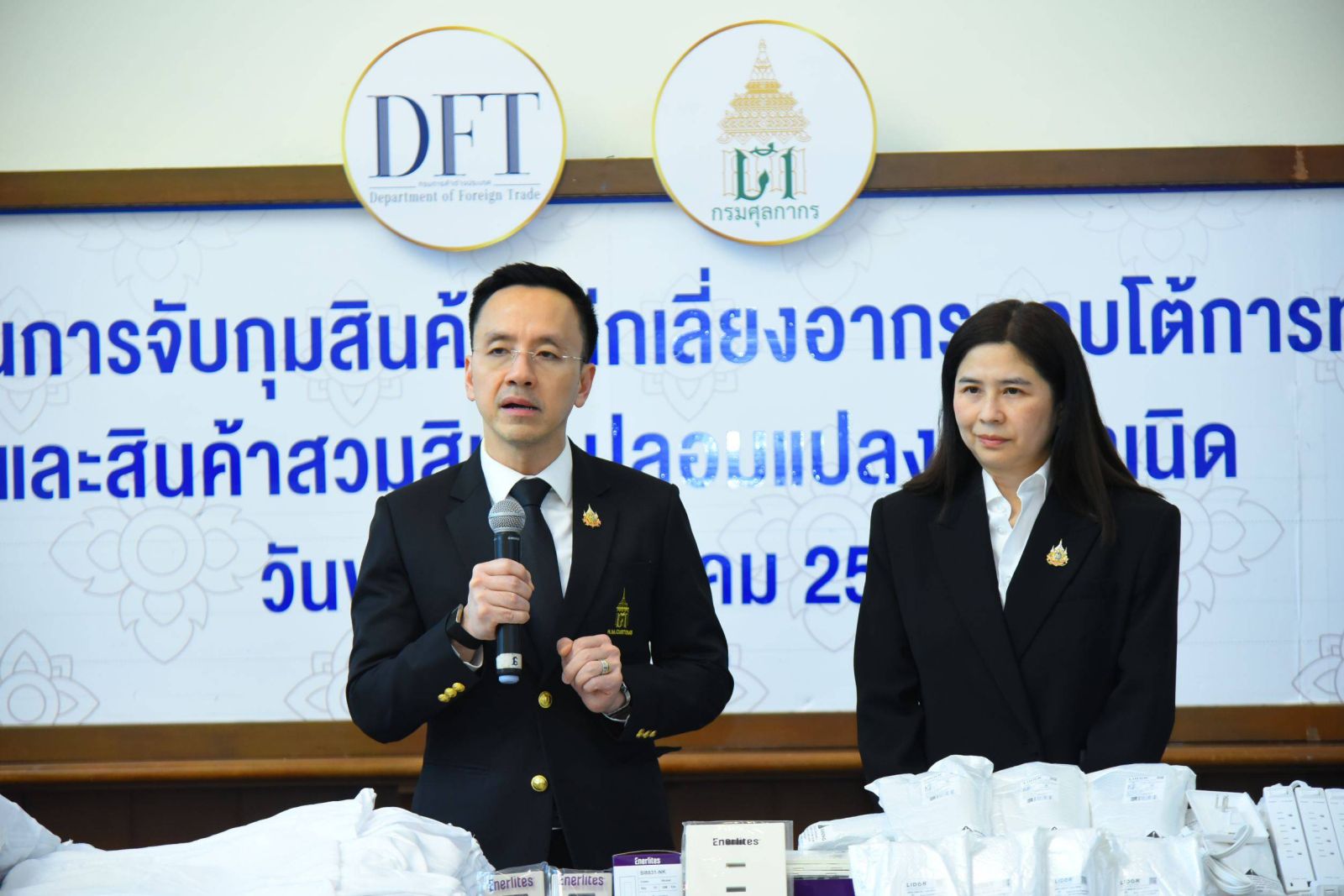 (4 มี.ค.69) นายพันธ์ทอง ลอยกุลนันท์ อธิบดีกรมศุลกากร และนางอารดา เฟื่องทอง อธิบดีกรมการค้าต่างประเทศร่วมแถลงผลงานการจับกุมสินค้าหลีกเลี่ยงอากรตอบโต้การทุ่มตลาด และสินค้าสวมสิทธิ์ปลอมแปลงถิ่นกำเนิด ตั้งแต่ต้นปีงบประมาณ 2569 มูลค่าความเสียหายกว่า 503 ล้านบาท ณ ห้องโถงชั้น 1 อาคาร 1 กรมศุลกากร