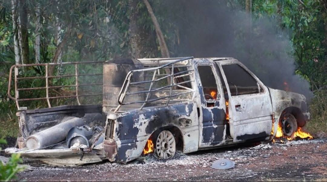 ที่เกิดเหตุ พบว่าเพลิงลุกไหม้รถกระบะอย่างรุนแรงจนเหลือกลายเป็นซากรถ โดยที่ท้ายกระบะมีถังน้ำมันขนาด 200 ลิตร 2 ถัง และถังแก๊ส 2 ถัง ถูกไฟเผาจนระเบิดเสียหายทั้งหมดแล้ว