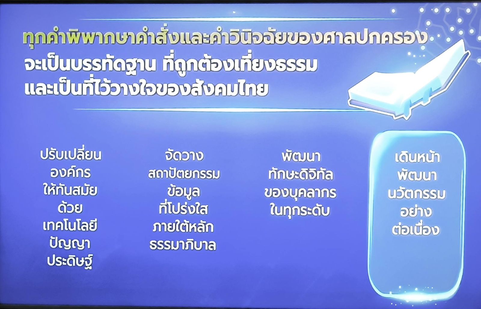 ในโอกาสครบรอบ 25 ปี และก้าวสู่ปีที่ 26 ศาลปกครองมีความมุ่งมั่นที่จะยกระดับการอำนวยความยุติธรรมทางปกครอง ให้เท่าทันต่อการเปลี่ยนแปลงของโลกดิจิทัล โดยได้กำหนดแนวทางการขับเคลื่อนองค์กรเพื่อมุ่งสู่การเป็น “ศาลปกครองอิเล็กทรอนิกส์ที่สมบูรณ์ (e-Admincourt)” ภายในปี พ.ศ. ๒๕๗๐ อย่างเต็มรูปแบบ และเพื่อเป็นการเตรียมความพร้อมของศาลปกครองในก้าวต่อไปสู่การเป็นศาลปกครองอัจฉริยะในปี พ.ศ. 2575 ศาลปกครองกำลังขับเคลื่อนการพัฒนาต้นแบบการประยุกต์ใช้เทคโนโลยีปัญญาประดิษฐ์ เพื่อเสริมสร้างประสิทธิภาพในการอำนวยความยุติธรรมให้แก่ประชาชน และสนับสนุนการบริหารจัดการคดีอย่างเป็นระบบ ควบคู่กับการวางรากฐานธรรมาภิบาลข้อมูล และธรรมาภิบาลปัญญาประดิษฐ์ (Data Governance and AI Governance) ได้แก่ การยกระดับการบริการประชาชนด้วยปัญญาประดิษฐ์ การพัฒนาระบบต้นแบบของศาลปกครองอัจฉริยะที่ช่วยเพิ่มประสิทธิภาพการพิจารณาพิพากษาคดีในทุกขั้นตอน รวมทั้งการทดสอบการประยุกต์ใช้ปัญญาประดิษฐ์สำหรับการพัฒนาศาลปกครองอัจฉริยะและระบบบริการอัตโนมัติด้วย Generative AI ตลอดจนการจัดทำพิมพ์เขียว (Blueprint) สำหรับการประยุกต์ใช้เทคโนโลยี AI กับภารกิจของศาลปกครองได้อย่างเหมาะสม คุ้มค่า และเกิดประสิทธิภาพสูงสุด