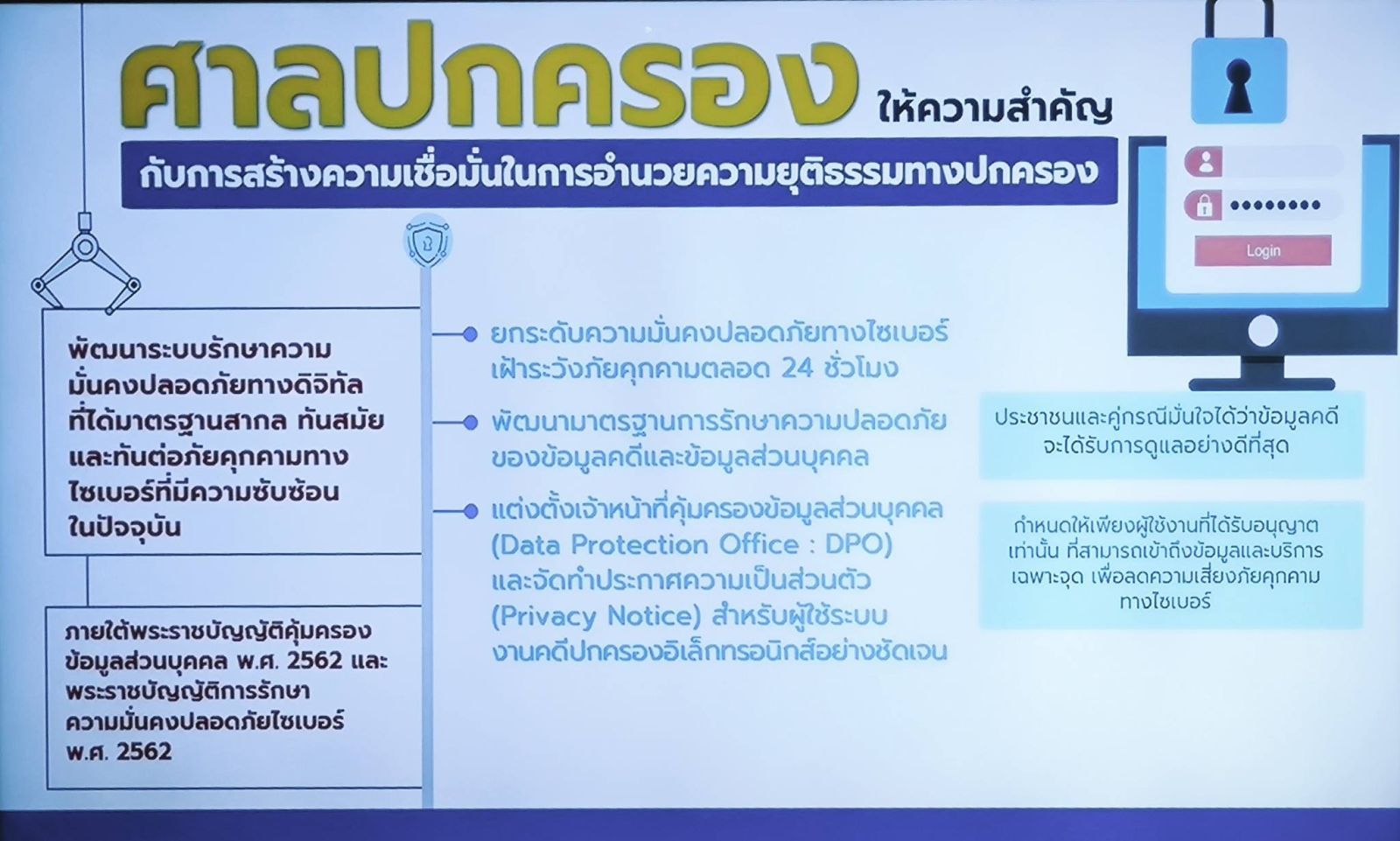 นอกจากการพัฒนาเทคโนโลยีดิจิทัล เพื่อยกระดับการดำเนินงานและการให้บริการประชาชนแล้ว ศาลปกครองได้ให้ความสำคัญกับการสร้างความเชื่อมั่นในการอำนวยความยุติธรรมทางปกครอง โดยมุ่งเน้น การพัฒนาระบบรักษาความมั่นคงปลอดภัยทางดิจิทัลที่ได้มาตรฐานสากล ทันสมัยและทันต่อภัยคุกคามทางไซเบอร์ที่มีความซับซ้อนในปัจจุบัน ภายใต้มาตรฐานตามกฎหมาย อาทิ พระราชบัญญัติคุ้มครองข้อมูลส่วนบุคคล พ.ศ. 2562 และพระราชบัญญัติการรักษาความมั่นคงปลอดภัยไซเบอร์ พ.ศ. 2562 เป็นต้น โดยยกระดับความมั่นคงปลอดภัยทางไซเบอร์ เฝ้าระวังภัยคุกคามตลอด 24 ชั่วโมง พัฒนามาตรฐานการรักษาความปลอดภัยของข้อมูลคดีและข้อมูลส่วนบุคคล เพื่อให้ประชาชนและคู่กรณีมั่นใจได้ว่า ข้อมูลคดีจะได้รับการดูแลอย่างดีที่สุด มีการแต่งตั้งเจ้าหน้าที่คุ้มครองข้อมูลส่วนบุคคล (Data Protection Office : DPO) และจัดทำประกาศความเป็นส่วนตัว (Privacy Notice) สำหรับผู้ใช้ระบบงานคดีปกครองอิเล็กทรอนิกส์อย่างชัดเจน โดยกำหนดให้เพียงผู้ใช้งานที่ได้รับอนุญาตเท่านั้น ที่สามารถเข้าถึงข้อมูลและบริการเฉพาะจุดเพื่อลดความเสี่ยงภัยคุกคามทางไซเบอร์ ตลอดจนมีระบบสำรองและกู้คืนข้อมูลเพื่อความต่อเนื่องของการบริการ กรณีมีภัยพิบัติหรือเหตุไม่คาดคิดเกิดขึ้น เพื่อให้การอำนวยความยุติธรรมทางปกครองไม่หยุดชะงัก ทั้งมีแผนการสำรองข้อมูล (Backup Plan) ศูนย์สำรองข้อมูล (Data Center) รวมถึงเทคโนโลยีการกู้คืนที่รวดเร็ว เพื่อให้สามารถนำข้อมูลกลับมาใช้งานได้อย่างรวดเร็วและถูกต้องแม่นยำ