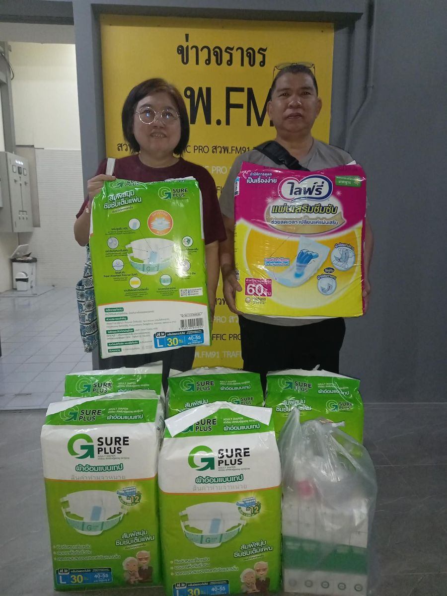 ที่สถานีวิทยุ สวพ.FM91 ในนาม คุณแม่พรทิพย์ มัธยัสถ์สิน 'ครอบครัวมัธยัสถ์สิน' ร่วมบริจาค ผ้าอ้อมผู้ใหญ่ จำนวน 6 ห่อ แผ่นรองซับ 1 ห่อ ยาน้ำระบายแบบขวด ยาน้ำสวนทวารแบบขวด ผ่าน Give Never Stop โครงการมอบอุปกรณ์ช่วยชีวิต โดยกรุงเทพประกันภัย และ สวพ.FM91