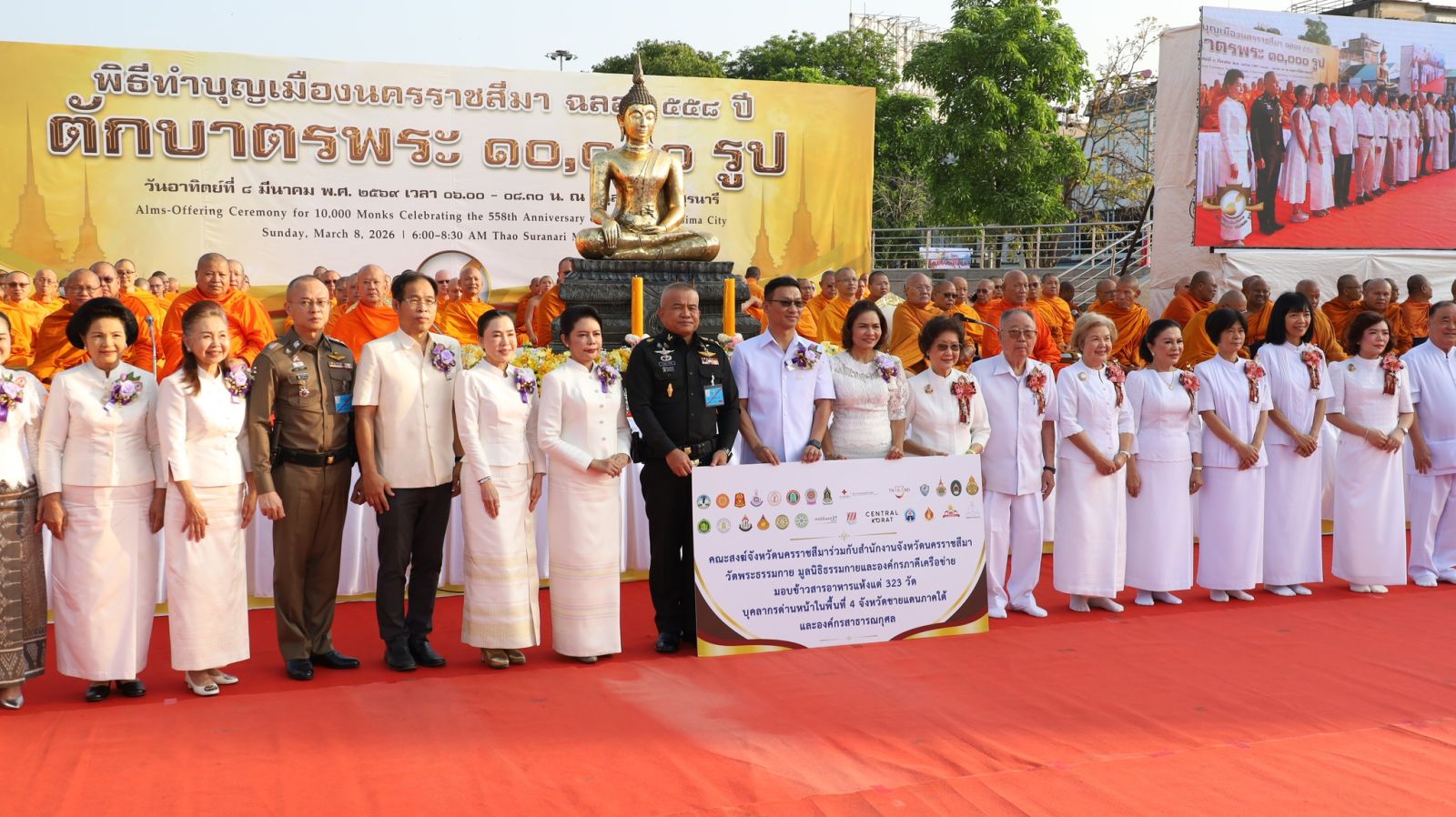 ด้าน พระเทพสีมาภรณ์ เจ้าคณะจังหวัดนครราชสีมา กล่าวว่า ชาวโคราชโชคดีเพราะเรามีความรักความสามัคคีในการทำความดีร่วมกัน ที่อื่นหาโอกาสทำบุญใหญ่แบบนี้ได้ยาก แต่โคราชทำได้ทุกปี เป็นเรื่องที่น่าชื่นชมยินดีอย่างยิ่ง การตักบาตรพระสงฆ์จำนวนมากอย่างนี้นอกจากจะเป็นการสร้างความมั่นคงให้กับพระพุทธศาสนา ยังสร้างความสามัคคีให้เกิดขึ้นกับสังคมโคราชด้วย ข้าวสารอาหารแห้งที่ได้นจากการบิณฑบาตจะเป็นกำลังเรี่ยวแรงให้กับพระสงฆ์ในจังหวัดนครราชสีมาแล้ว ยังจะได้นำไปบรรเทาความเดือดร้อนของคณะสงฆ์ 323 วัด พร้อมทั้งครูและทหารที่ปฏิบัติหน้าที่อยู่ในพื้นที่เสี่ยงภัย 4 จังหวัดภาคใต้ และมอบช่วยเหลือประชาชนที่ประสบภัยพิบัติต่างๆในพื้นที่จังหวัดนครราชสีมาเป็นสาธารณะสงเคราะห์อีกด้วย