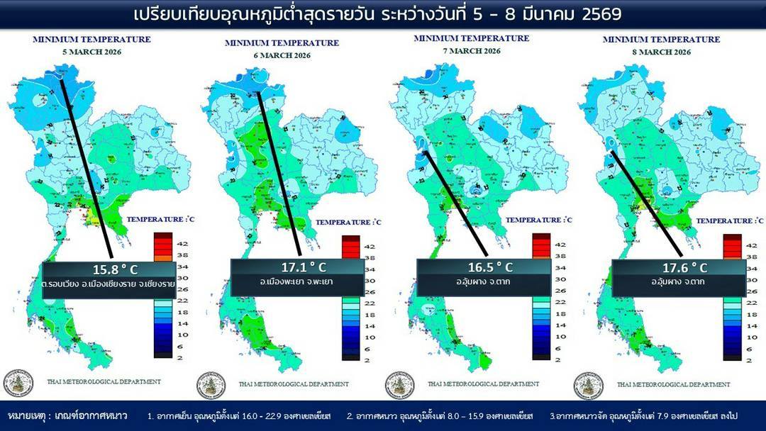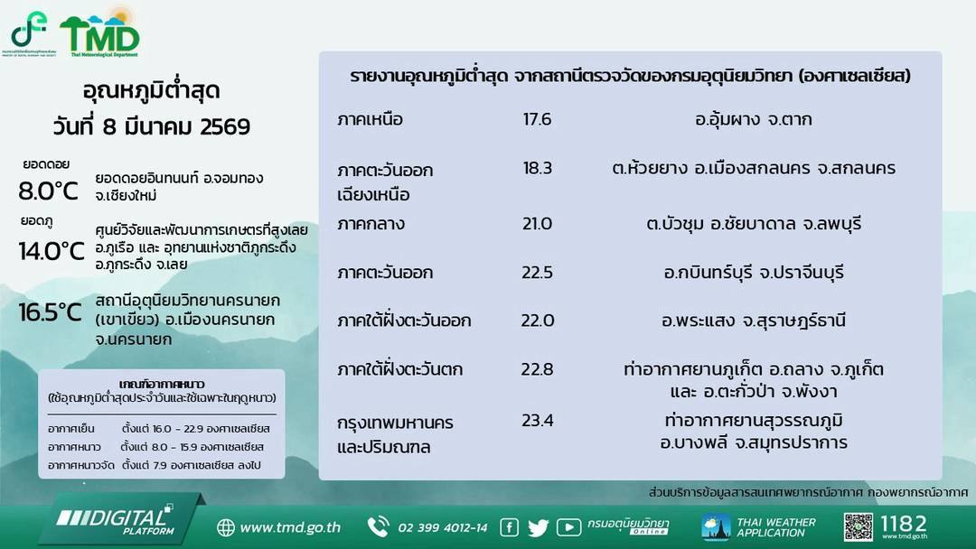 อุณหภูมิต่ำสุดบริเวณประเทศไทย เมื่อเช้าวันนี้ (8 มี.ค. 69) วัดได้ 17.6 องศาเซลเซียส ที่ อ.อุ้มผาง จ.ตาก