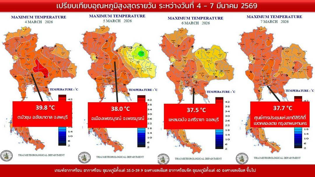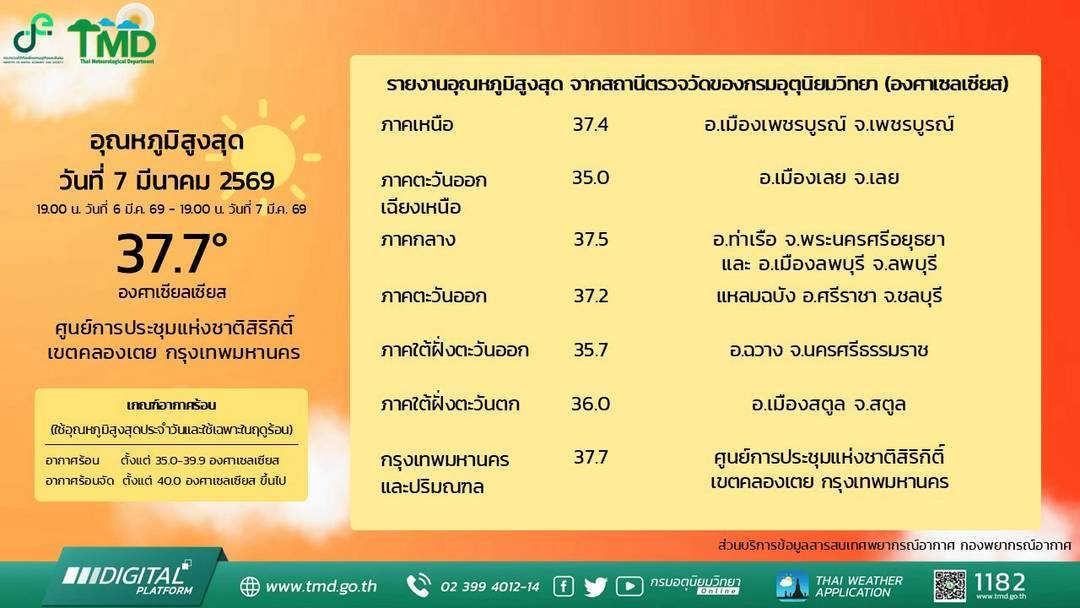 อุณหภูมิสูงสุดบริเวณกรุงเทพมหานครและปริมณฑล เมื่อวานนี้(7 มี.ค. 69) วัดได้ 37.7 องศาเซลเซียส ที่ศูนย์ประชุมแห่งชาติสิริกิติ์ เขตคลองเตย กรุงเทพมหานคร