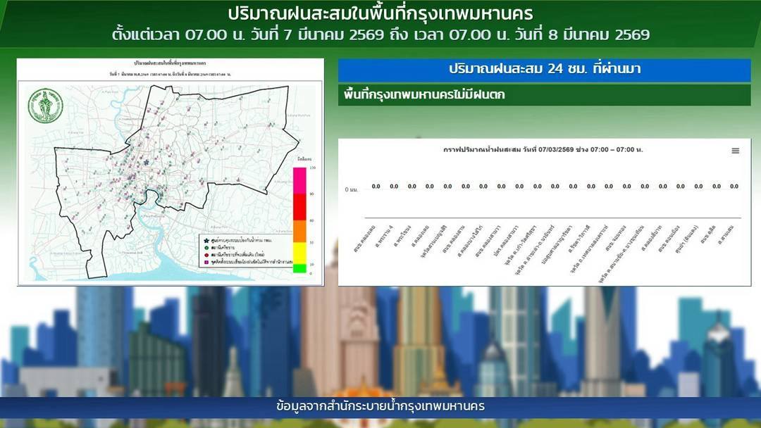 ปริมาณฝนสะสม 24 ชม.ในพื้นที่กรุงเทพมหานคร รายงานจากสำนักการระบายน้ำ (ตั้งแต่เวลา 07.00 น.ของวันที่ 7 มี.ค. 69 ถึง เวลา 07.00 น. ของวันที่ 8 มี.ค. 69) ไม่มีมีรายงานฝนตกในพื้นที่