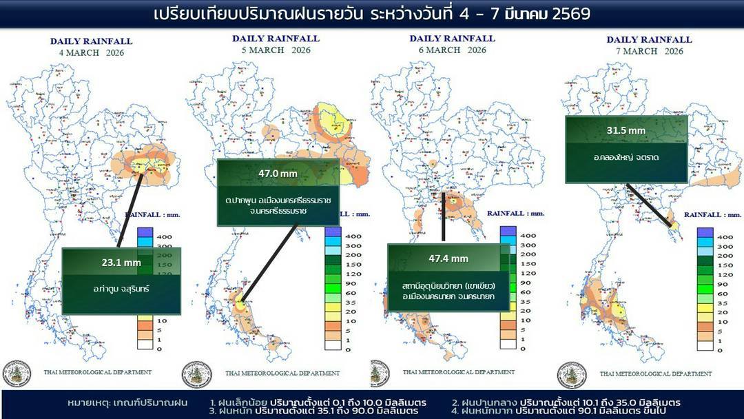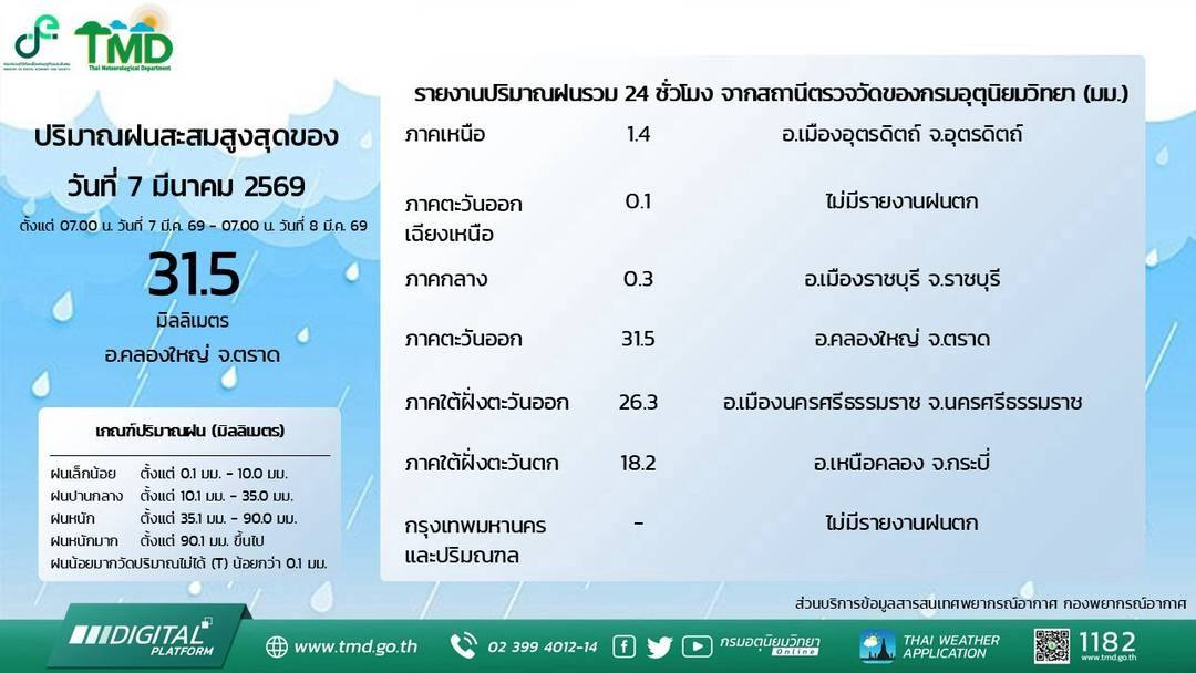 รายงานฝนสะสม 24 ชม.ที่ผ่านมา(7 มี.ค. 69) ตั้งแต่เวลา 07.00 น.ของวันที่ 7 มี.ค. 69 ถึง เวลา 07.00 น. ของวันที่ 8 มี.ค. 69 ของสถานีอุตุนิยมวิทยา มีรายงานฝนตกเล็กน้อยถึงปานกลาง ปริมาณฝนสูงสุดวัดได้ 31.5 มม. ที่ สถานีอุตุนิยมวิทยา(เขาเขียว) อ.เมืองนครศรีธรรมราช จ.นครศรีธรรมราช