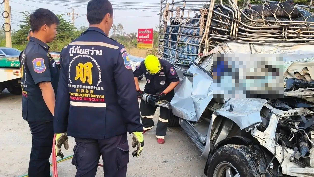 รถกระบะชนกับรถพ่วง กลางถนนเพชรเกษม มีผู้เสียชีวิตชาย 1 ราย ติดค้างอยู่ภายในซากรถ จ.ราชบุรี