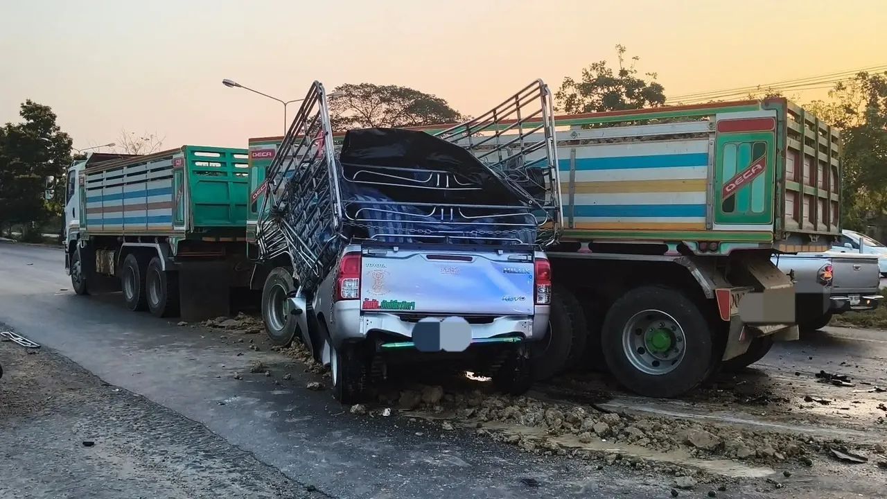 ที่เกิดเหตุ พบรถบรรทุกพ่วง 20 ล้อ อีซูซุ สีขาว บรรทุกดินมาเต็มคันทั้งตัวแม่และตัวพ่วง ที่บริเวณใต้ท้องรถพ่วง พบรถยนต์กระบะโตโยต้า ตอนเดียว มีคอก สีเทา บรรทุกหมากสด มาเต็มคันรถ พุ่งเสียบใต้ท้องรถบรรทุกพ่วง ด้านหน้าพังยับกลายเป็นเศษเหล็ก