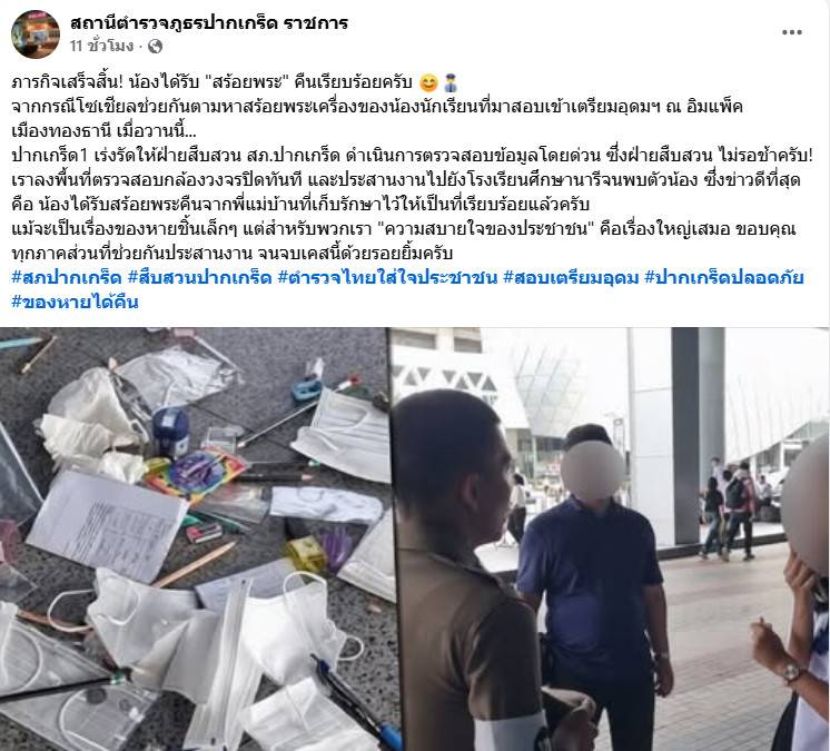 ปากเกร็ด1 เร่งรัดให้ฝ่ายสืบสวน สภ.ปากเกร็ด ดำเนินการตรวจสอบข้อมูลโดยด่วน ซึ่งฝ่ายสืบสวน ไม่รอช้าครับ! เราลงพื้นที่ตรวจสอบกล้องวงจรปิดทันที และประสานงานไปยังโรงเรียนศึกษานารีจนพบตัวน้อง ซึ่งข่าวดีที่สุดคือ น้องได้รับสร้อยพระคืนจากพี่แม่บ้านที่เก็บรักษาไว้ให้เป็นที่เรียบร้อยแล้วครับ