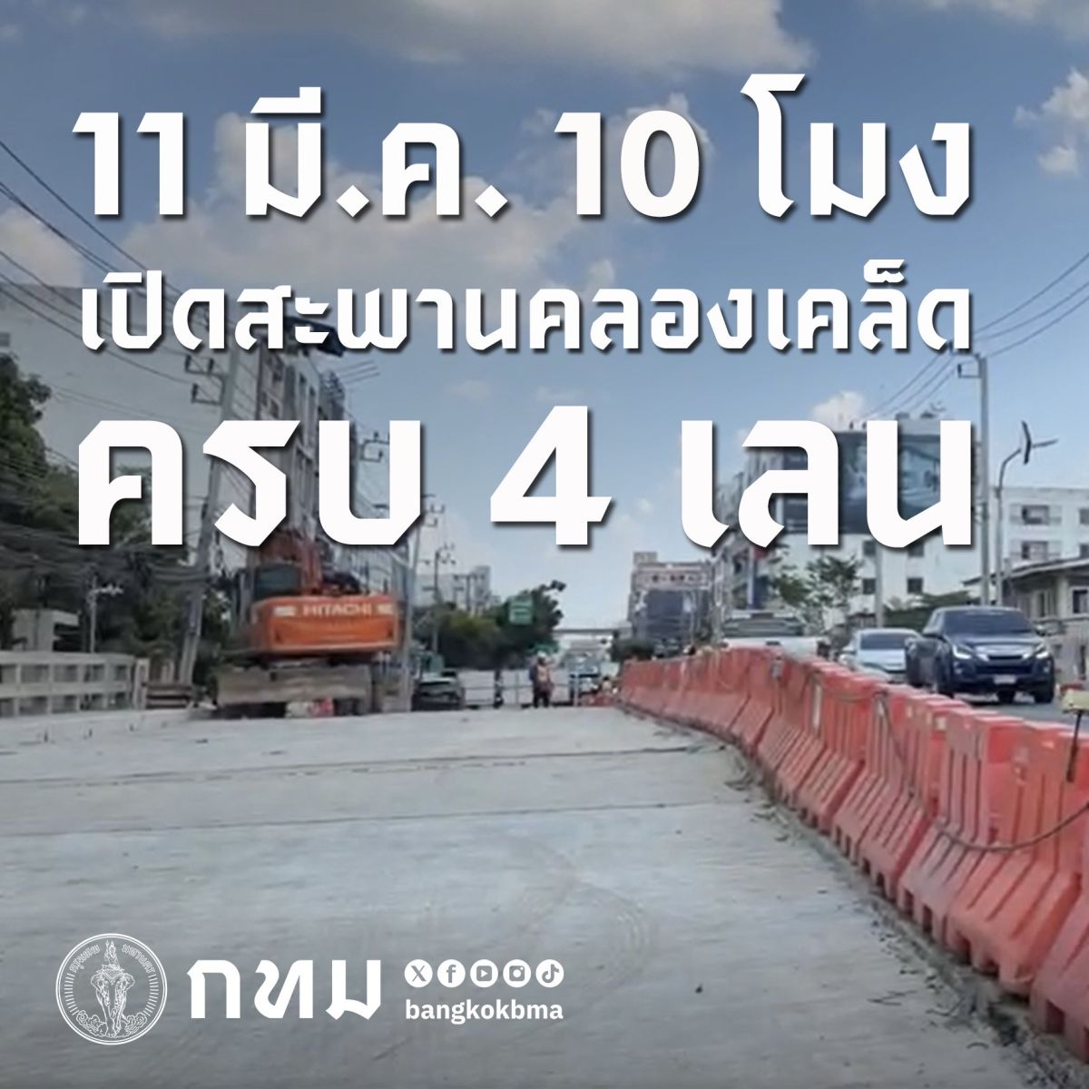 เมื่อวันที่ 7 มี.ค. 69 นายวิศณุ ทรัพย์สมพล รองผู้ว่าราชการกรุงเทพมหานคร พร้อมด้วยสำนักการระบายน้ำ ลงพื้นที่ตรวจติดตามความก้าวหน้าโครงการก่อสร้างอุโมงค์ระบายน้ำจากบึงหนองบอนลงสู่แม่น้ำเจ้าพระยา ณ บริเวณงานคืนสภาพสะพานข้ามคลองเคล็ด ถนนอุดมสุข เขตประเวศ โดยกล่าวว่า ขณะนี้การซ่อมแซมบริเวณสะพานข้ามคลองเคล็ดส่วนที่เหลืออีก 2 ช่องจราจรใกล้เสร็จสมบูรณ์แล้ว โดยปัจจุบันงานโครงสร้างสะพานแล้วเสร็จทั้งหมดแล้ว และจะทำการปูยางแอสฟัลท์ผิวจราจร วันที่ 7-8 มี.ค. 69 และตีเส้นจราจร วันที่ 9-10 มี.ค. 69 ซึ่งจะเปิดให้รถสัญจรได้ทั้งหมด 4 ช่องจราจร ในวันพุธที่ 11 มี.ค. 69 เวลา 10.00 น. เร็วกว่ากำหนดการณ์เดิมวันที่ 15 มี.ค. 69