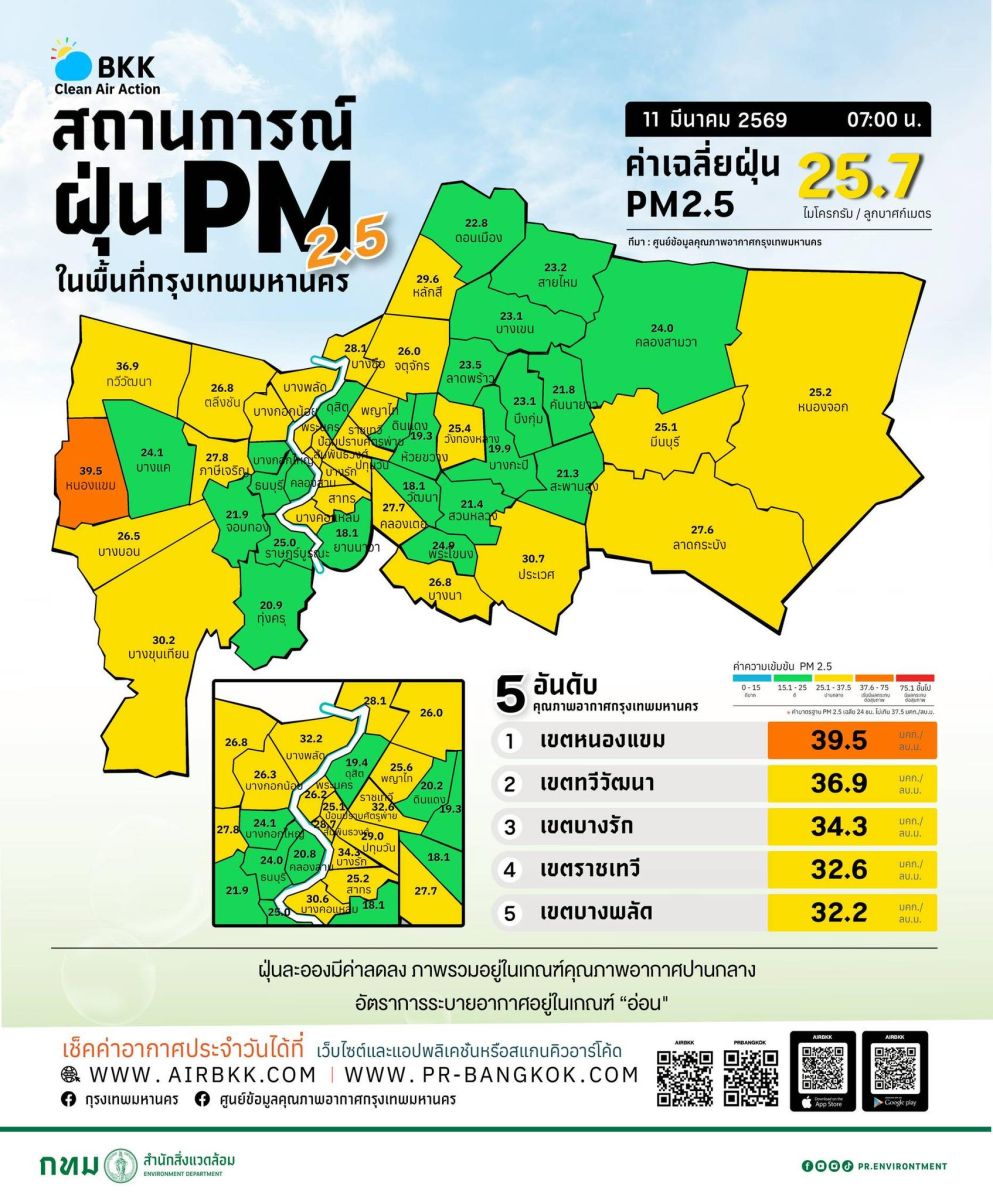 ศูนย์ข้อมูลคุณภาพอากาศกรุงเทพมหานคร ขอรายงานสถานการณ์ฝุ่นละอองขนาดไม่เกิน 2.5 ไมครอน (PM 2.5) ในกรุงเทพมหานคร ประจำวันที่ 11 มีนาคม 2569 เวลา 07:00 น. ค่าเฉลี่ยของกรุงเทพมหานคร 25.7 ไมโครกรัมต่อลูกบาศก์เมตร (มคก./ลบ.ม.) (ค่ามาตรฐานไม่เกิน 37.5 มคก./ลบ.ม.)