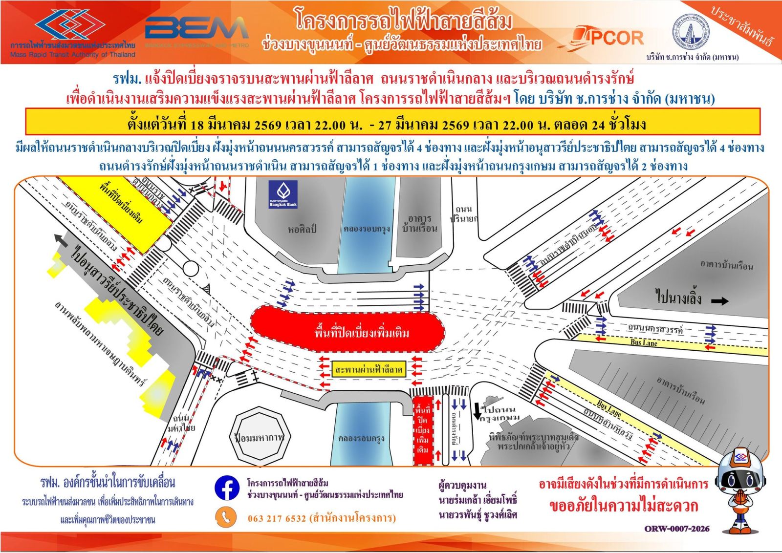 รฟม. แจ้งปิดเบี่ยงการจราจรบนสะพานผ่านฟ้าลีลาศ ถนนราชดำเนินกลาง และบริเวณถนนดำรงรักษ์ เพื่อดำเนินงานเสริมความแข็งแรงสะพานผ่านฟ้าลีลาศ โครงการรถไฟฟ้าสายสีส้ม ช่วงบางขุนนนท์ - ศูนย์วัฒนธรรมแห่งประเทศไทย ตั้งแต่วันที่ 18 มีนาคม 2569 – 11 เมษายน 2570 เวลา 24.00 น. ตลอด 24 ชั่วโมง