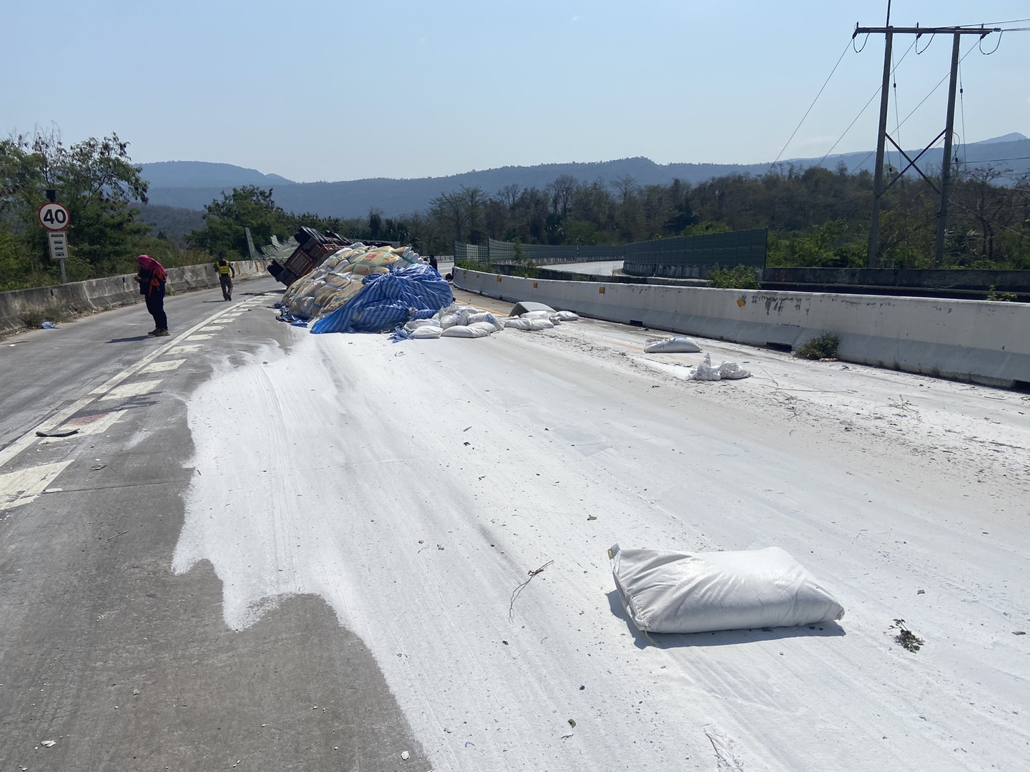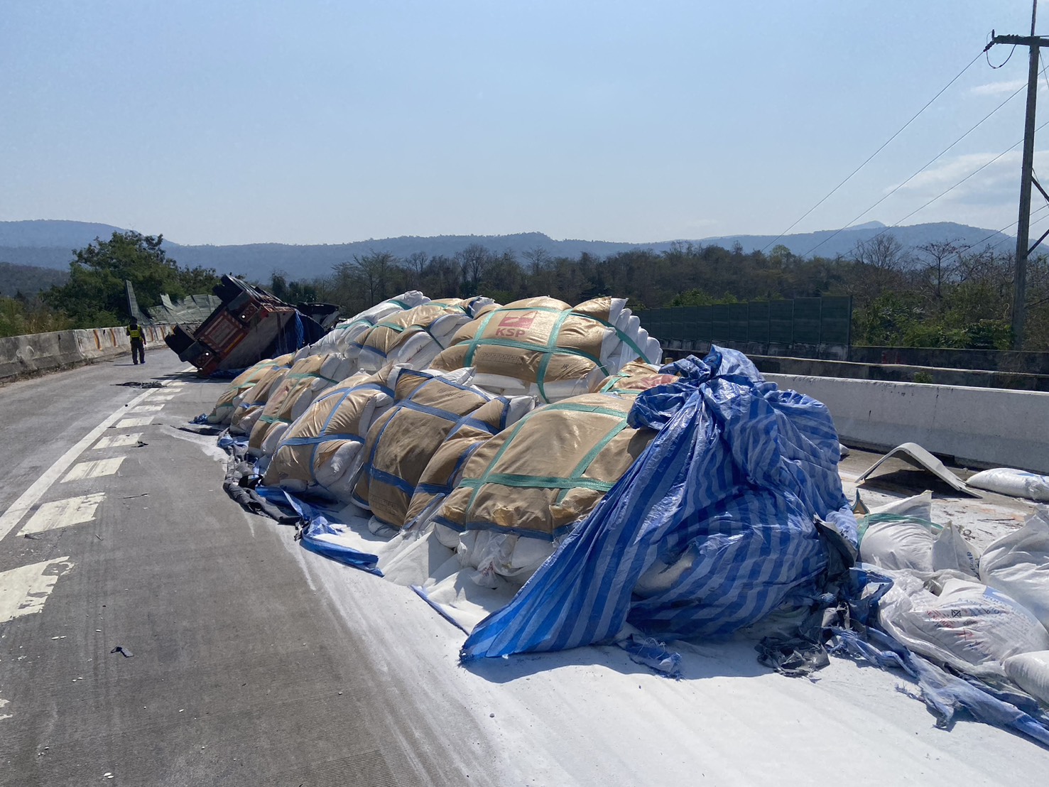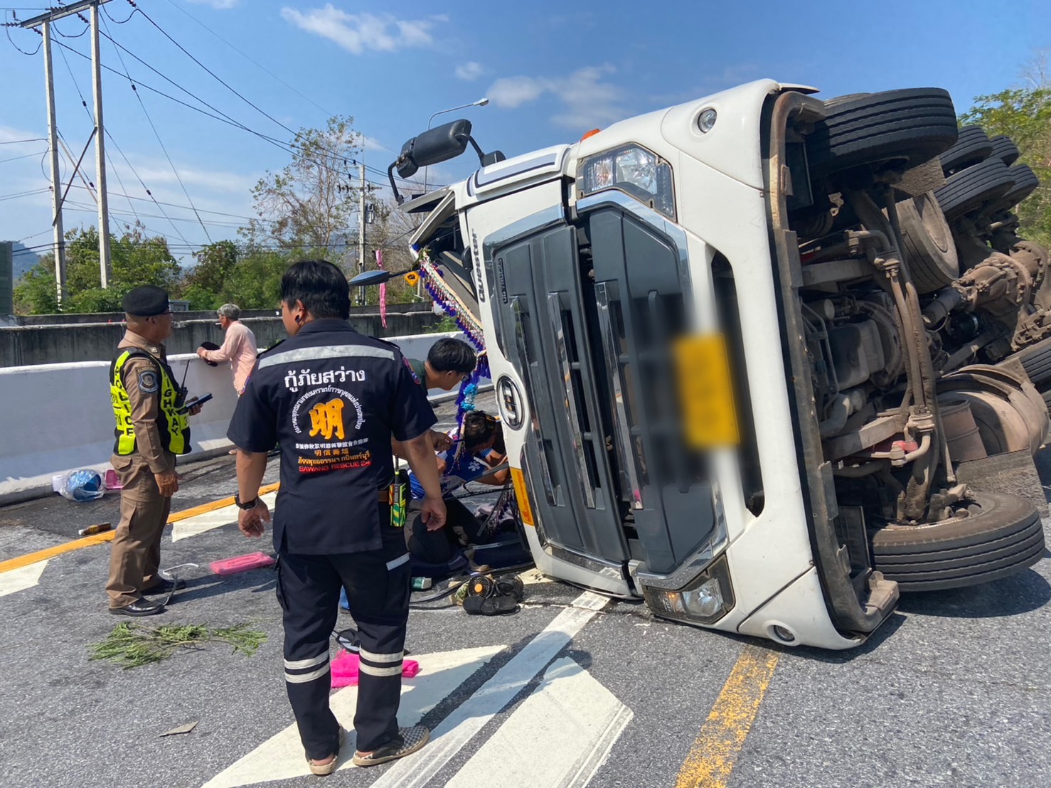 อุบัติเหตุรถบรรทุกกึ่งพ่วงบรรทุกน้ำตาลเสียหลักพลิกตะแคง
