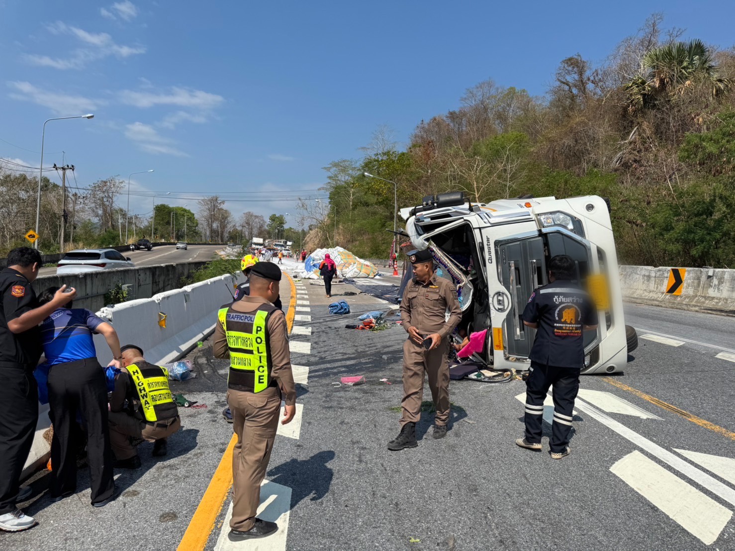 เวลา 10.01 น. วันที่ 14 มีนาคม 2569 ตำรวจทางหลวง เข้าตรวจสอบเหตุรถบรรทุกกึ่งพ่วงบรรทุกน้ำตาลเกิดอุบัติเหตุเสียหลัก พลิกตะแคง ด้วยตัวเอง บริเวณทางหลวงหมายเลข 304 กม.208+900 ขาเข้า กทม. ส่งผลให้กีดขวางการจราจร