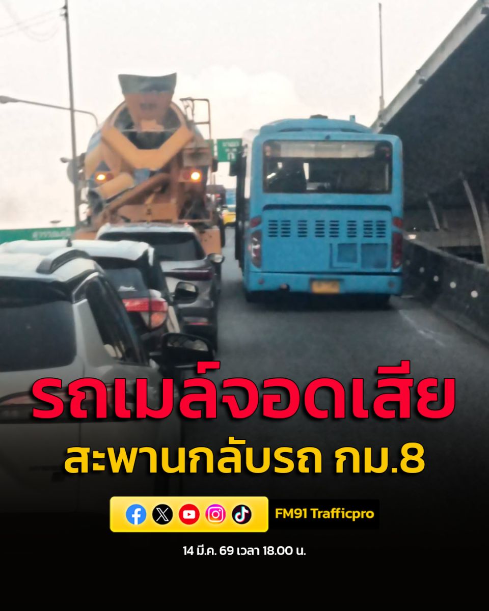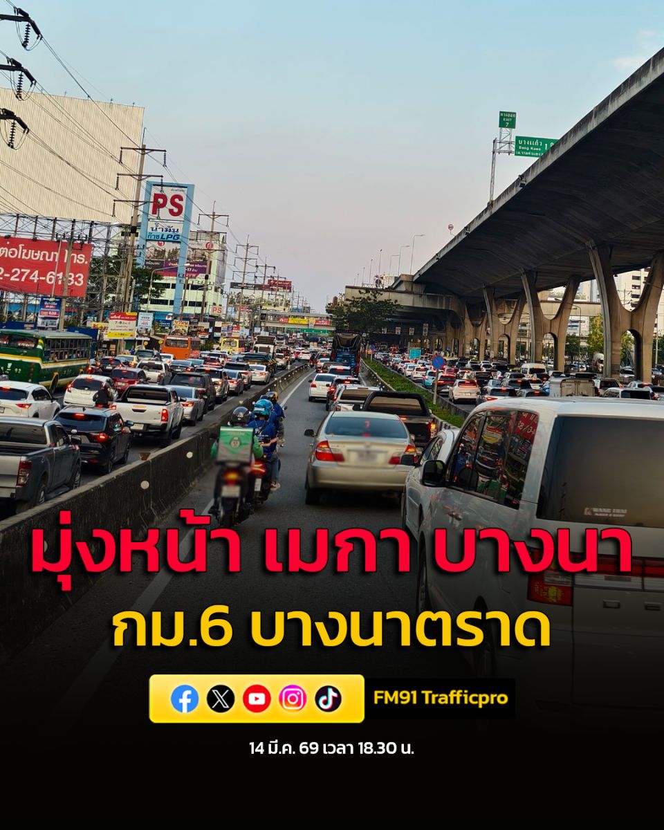 14 มี.ค. 69 เวลา 18.35 น. ถ.บางนาตราด ขาออก เชิงทางขึ้นสะพานกลับรถเมกา บางนา (กม.8)