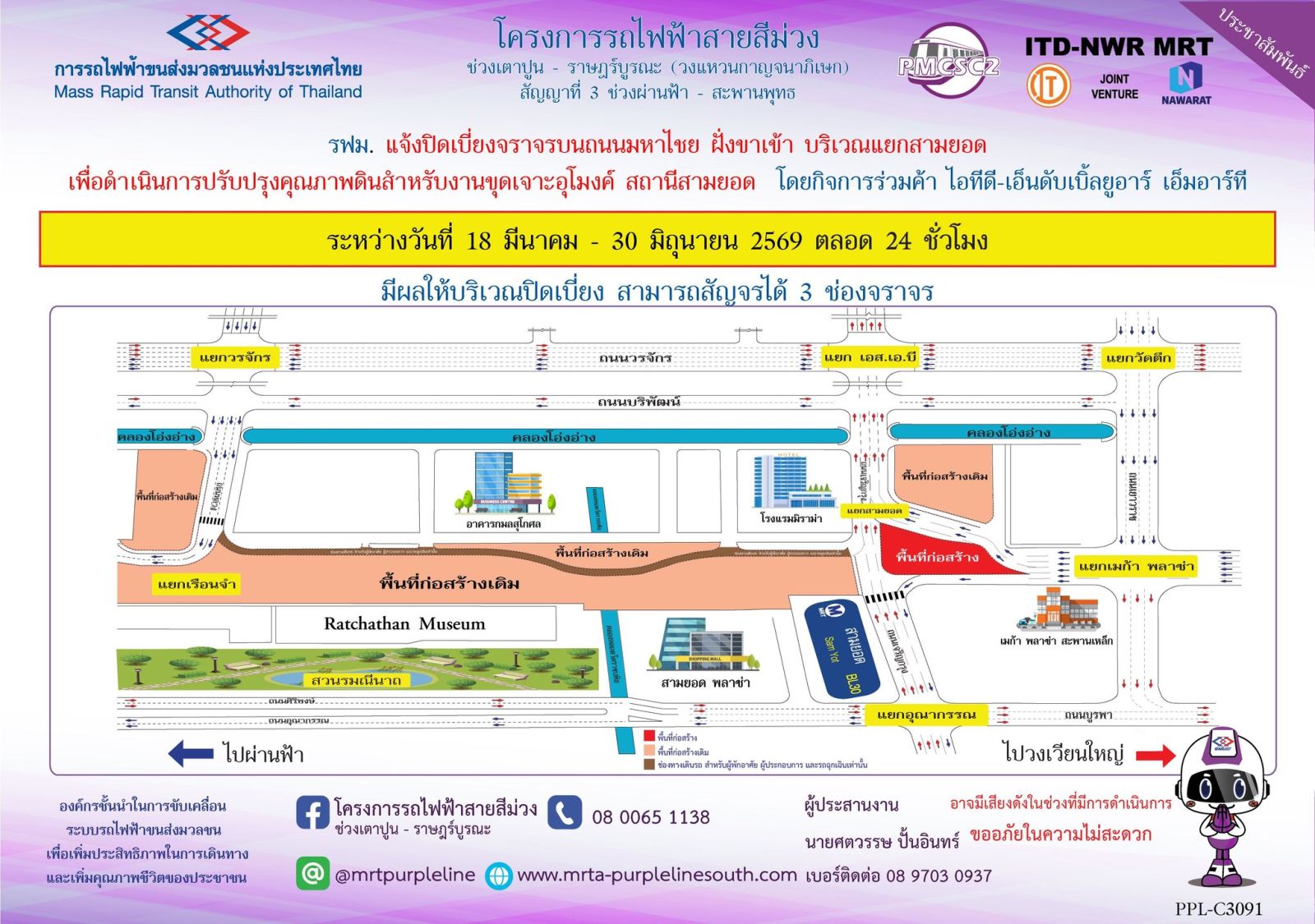 การรถไฟฟ้าขนส่งมวลชนแห่งประเทศไทย (รฟม.) แจ้งว่า กิจการร่วมค้า ไอทีดี-เอ็นดับเบิ้ลยูอาร์ เอ็มอาร์ที ผู้รับจ้างงานออกแบบและก่อสร้างอุโมงค์ทางวิ่งและสถานีใต้ดิน โครงการรถไฟฟ้าสายสีม่วง ช่วงเตาปูน - ราษฎร์บูรณะ (วงแหวนกาญจนาภิเษก) สัญญาที่ 3 ช่วงผ่านฟ้า - สะพานพุทธ มีความจำเป็นต้องปิดเบี่ยงจราจรบนถนนมหาไชย ฝั่งขาเข้า บริเวณแยกสามยอด เพื่อดำเนินการปรับปรุงคุณภาพดิน สำหรับงานขุดเจาะอุโมงค์ สถานีสามยอด ระหว่างวันที่ 18 มีนาคม - 30 มิถุนายน 2569 ตลอด 24 ชั่วโมง มีผลให้บริเวณปิดเบี่ยง สามารถสัญจรได้ 3 ช่องจราจร