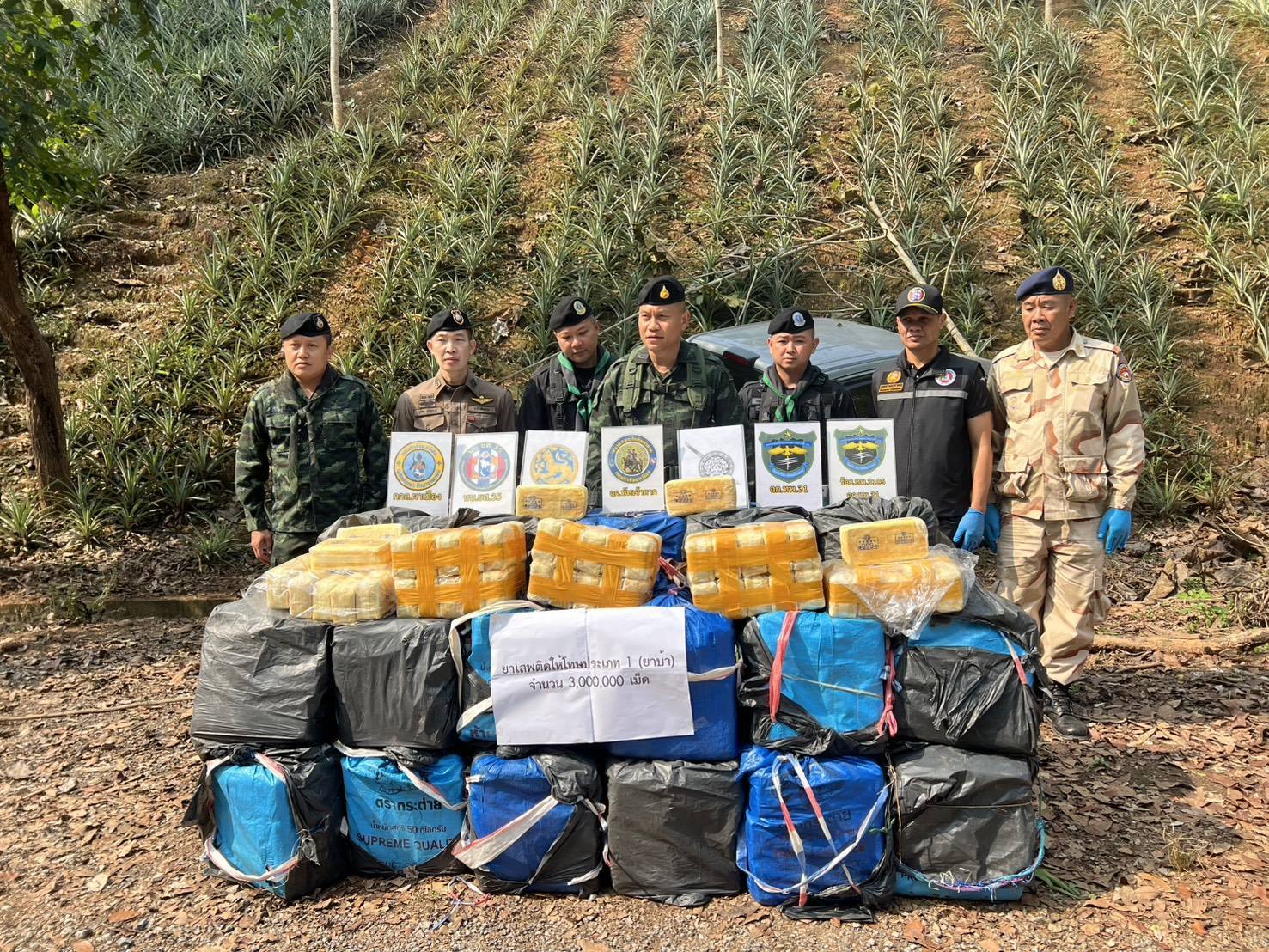 จากการตรวจค้น พบกระสอบฟางสีฟ้าห่อด้วยถุงพลาสติกสีดำ รวม 20 กระสอบ บรรจุยาบ้ากระสอบละประมาณ 150,000 เม็ด รวมประมาณ 3 ล้านเม็ด ส่วนคนร้ายอาศัยความมืดหลบหนีไปได้ เจ้าหน้าที่จึงควบคุมพื้นที่และตรวจสอบของกลางอย่างละเอียด ก่อนส่งมอบให้พนักงานสอบสวน สภ.แม่จัน ดำเนินคดีตามกฎหมายต่อไป