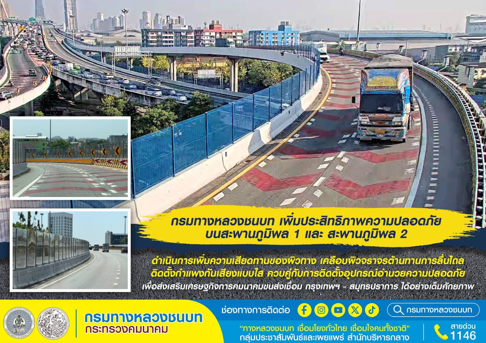 กรมทางหลวงชนบท เพิ่มประสิทธิภาพความปลอดภัย บนสะพานภูมิพล 1 และ สะพานภูมิพล 2 เพิ่มความเสียดทานของผิวทาง เคลือบผิวจราจร ต้านทานการลื่นไถล ติดตั้งกำแพงกันเสียงแบบใส ควบคู่กับการติดตั้งอุปกรณ์อำนวยความปลอดภัย เพื่อส่งเสริมเศรษฐกิจการคมนาคมขนส่ง เชื่อม กรุงเทพฯ - สมุทรปราการ ได้อย่างเต็มศักยภาพ