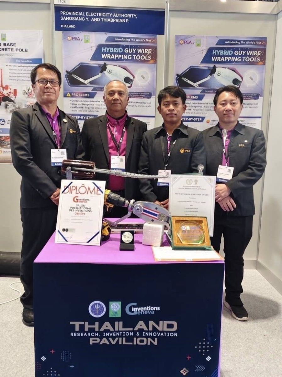 2. รางวัลระดับเหรียญเงิน (Silver Medal) จากผลงาน เครื่องมือพันสายยึดโยงแบบไฮบริด (Guy Wire Wrapping Tools) เพื่อช่วยเพิ่มประสิทธิภาพการปักเสาไฟฟ้าที่จำเป็นต้องประกอบชุดสายยึดโยง เพื่อยึดเสาไฟฟ้าให้มีความมั่นคง ป้องกันการเอียงหรือล้มจากแรงดึงของสายไฟฟ้า รวมถึงแรงลมและพายุ เครื่องมือนี้สามารถพันลวดเหล็กตีเกลียวเข้ากับลูกสเตรนแคลมป์ได้อย่างรวดเร็ว แม่นยำ และสม่ำเสมอ โดยอาศัยหลักการทำงานของชุดเฟืองทดรอบร่วมกับสว่านไร้สาย ช่วยลดระยะเวลาและแรงงานในการทำงาน เพิ่มความสะดวกและความปลอดภัยแก่ผู้ปฏิบัติงาน