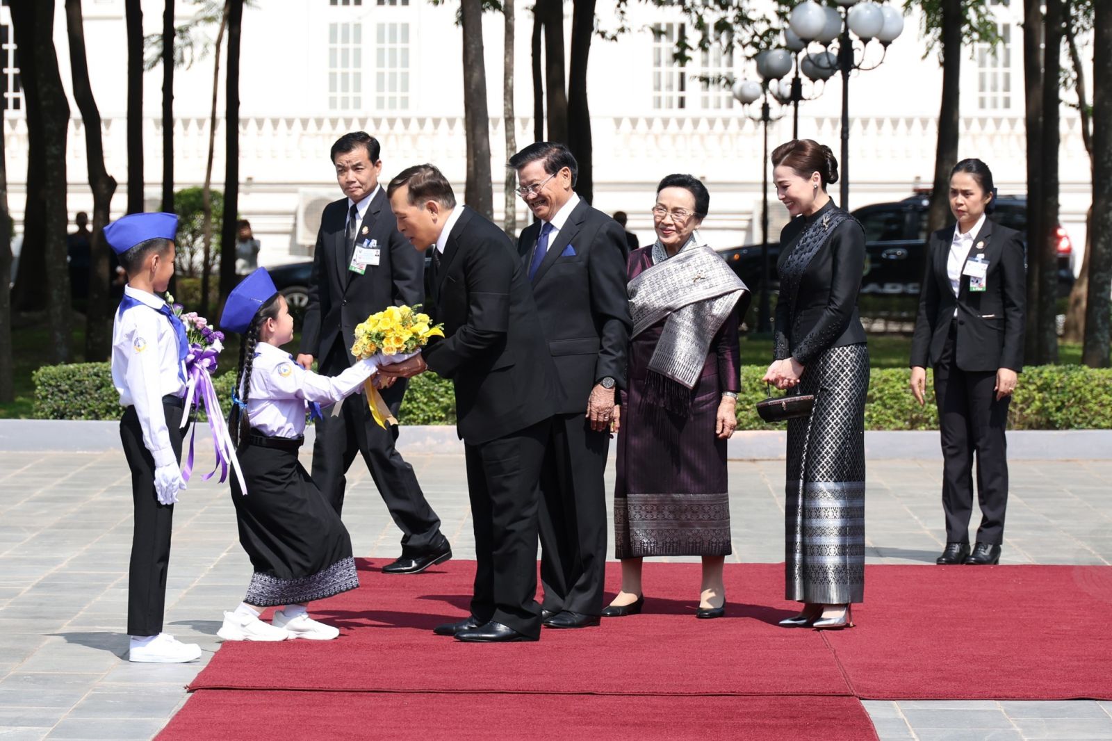 เมื่อเสด็จพระราชดำเนินถึง นายทองลุน ลีสุลิด ประธานประเทศแห่งสาธารณรัฐประชาธิปไตยประชาชนลาว และนางนาลี สีสุลิด ภริยา เฝ้าทูลละอองธุลีพระบาทรับเสด็จ จากนั้น เด็กหญิงชาวลาว และเด็กชายชาวลาว เฝ้าทูลละอองธุลีพระบาท ทูลเกล้าทูลกระหม่อมถวายช่อดอกไม้ แล้วเสด็จพระราชดำเนินพร้อมด้วยประธานประเทศขึ้นแท่นรับการถวายความเคารพ กองทหารเกียรติยศถวายความเคารพ และทรงตรวจแถวกองทหารเกียรติยศ เมื่อตรวจแถวทหารกองเกียรติยศ เสร็จแล้ว พระบาทสมเด็จพระเจ้าอยู่หัว และสมเด็จพระนางเจ้า ฯ พระบรมราชินี เสด็จพระราชดำเนินพร้อมด้วยประธานประเทศ และภริยา ไปยังแถวคณะทางการฝ่ายลาว ทรงรับการทูลแนะนำคณะทางการฝ่ายลาวตามลำดับ เสร็จแล้ว พระราชทานพระบรมราชวโรกาสให้ นายธานี ทองภักดี รองราชเลขานุการในพระองค์ แนะนำคณะทางการฝ่ายไทยแก่ประธานประเทศ และภริยา แล้วเสด็จขี้นหอคำ