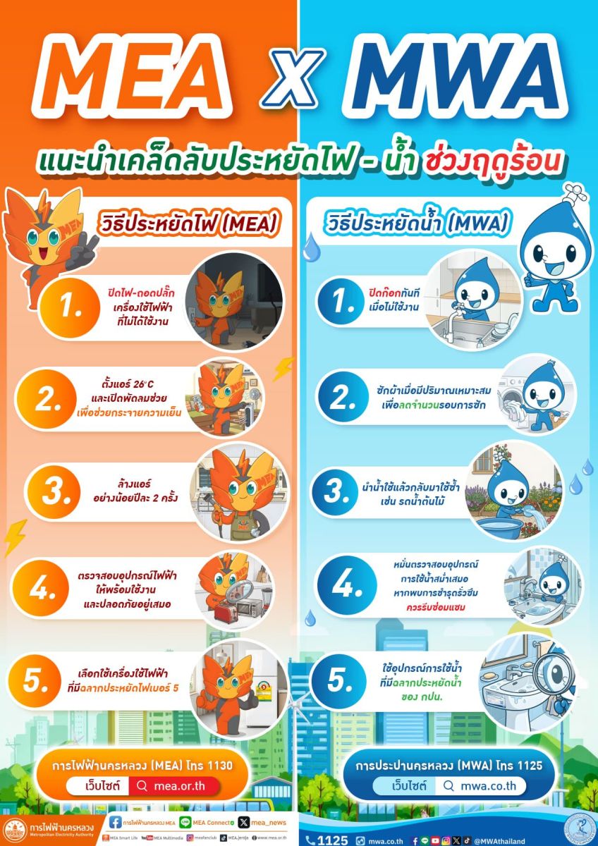 MEA หรือการไฟฟ้านครหลวง ร่วมกับ MWA หรือการประปานครหลวง ในฐานะหน่วยงานรัฐวิสาหกิจสังกัดกระทรวงมหาดไทย มีหน้าที่ดูแลระบบความมั่นคงระบบไฟฟ้า และประปา ในพื้นที่กรุงเทพมหานคร นนทบุรี และสมุทรปราการ แนะแนวทางบริหารจัดการพลังงานในภาคครัวเรือนช่วงฤดูร้อน เน้นย้ำการปรับเปลี่ยนพฤติกรรมใช้ไฟฟ้าอย่างถูกวิธีตามนโยบายรัฐบาล เพื่อลดภาระค่าใช้จ่ายและช่วยชาติประหยัดพลังงานอย่างยั่งยืน