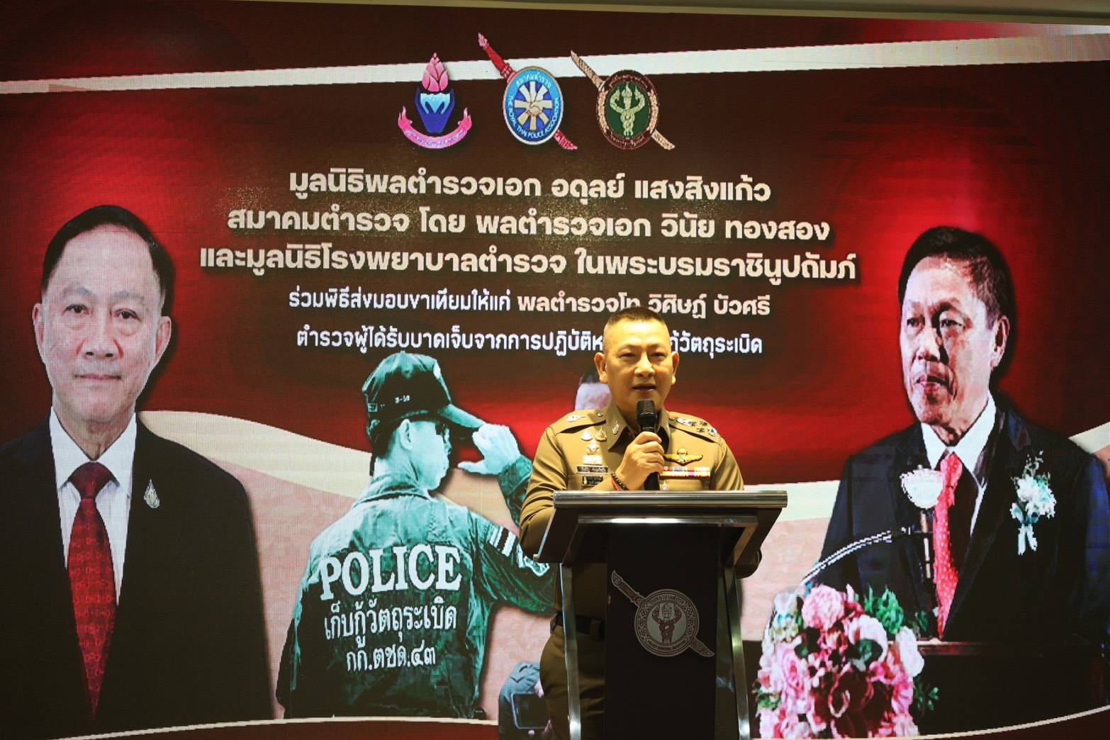 วันนี้ (18 มี.ค.69) ที่โรงพยาบาลตำรวจ พล.ต.อ.กิตติ์รัฐ พันธุ์เพ็ชร์ ผู้บัญชาการตำรวจแห่งชาติ ในฐานะประธานมูลนิธิโรงพยาบาลตำรวจ ในพระบรมราชินูปถัมภ์ รับมอบเงินจากมูลนิธิพลตำรวจเอก อดุลย์ แสงสิงแก้ว โดย พล.ต.อ.อดุลย์ แสงสิงแก้ว อดีตผู้บัญชาการตำรวจแห่งชาติ ในฐานะประธานมูลนิธิฯ จำนวน 200,000 บาท และสมาคมตำรวจ โดย พล.ต.อ.วินัย ทองสอง นายกสมาคมตำรวจ จำนวน 200,000 บาท ส่งต่อให้มูลนิธิโรงพยาบาลตำรวจ ในพระบรมราชินูปถัมภ์ ร่วมสานฝันทำขาเทียมเหนือเข่าให้ พล.ต.ท.วิศิษฎ์ บัวศรี ที่สูญเสียขาทั้ง 2 ข้างจากการปฏิบัติหน้าที่เก็บกู้ระเบิด