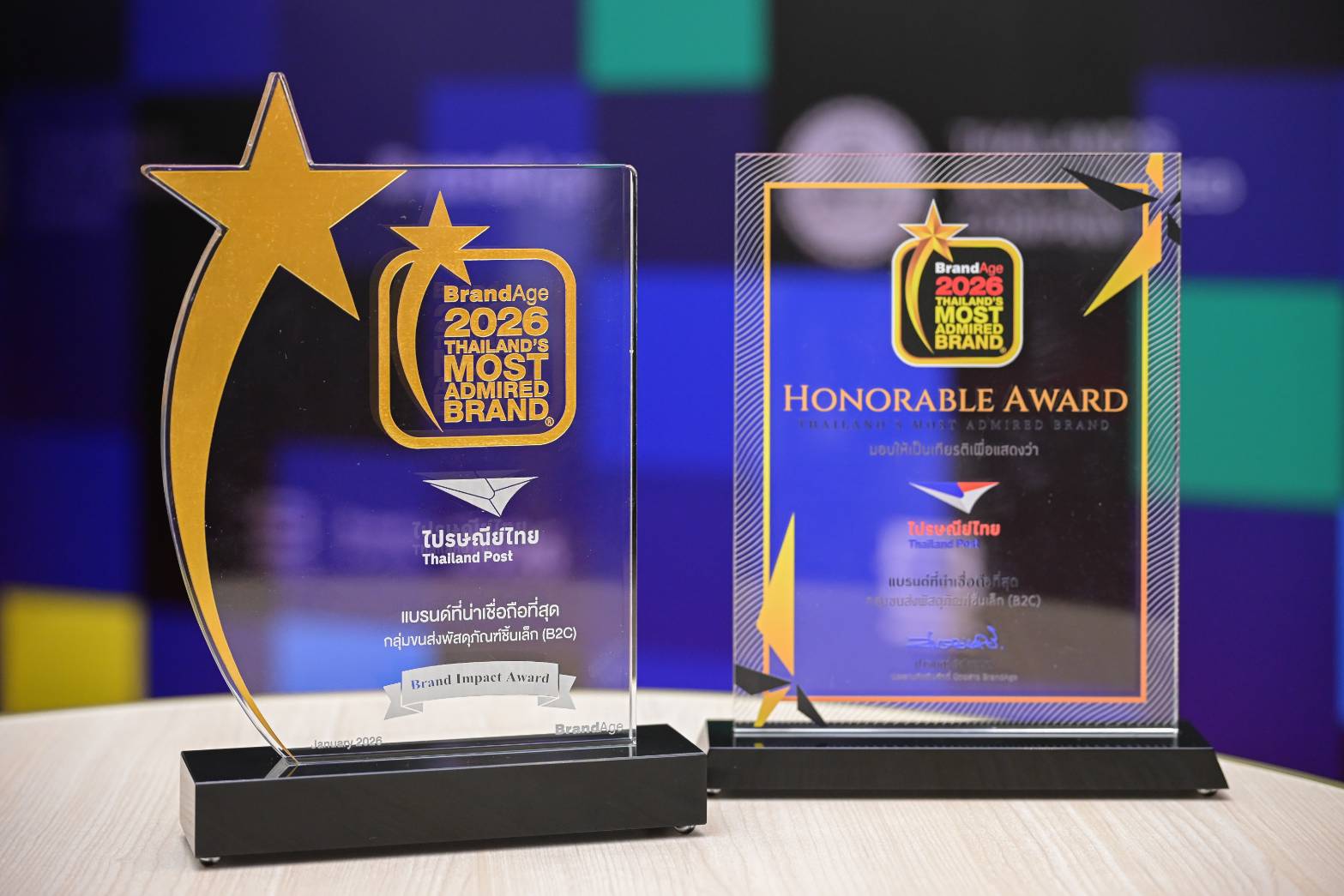 กรุงเทพฯ 18 มีนาคม 2569 – บริษัท ไปรษณีย์ไทย จำกัด คว้า 2 รางวัลใหญ่ จากเวที “Thailand’s Most Admired Brand 2026” ซึ่งมอบให้กับแบรนด์ที่ได้รับความน่าเชื่อถือและไว้วางใจจากผู้บริโภคได้ดีที่สุดประจำปี 2569 โดยไปรษณีย์ไทยได้คะแนนอันดับ 1 ในหมวด “บริการขนส่ง” กลุ่ม “ขนส่งพัสดุภัณฑ์ชิ้นเล็ก (B2C)” ต่อเนื่องเป็นปีที่ 2 สะท้อนความไว้วางใจของผู้บริโภคทั่วประเทศ และพลังแบรนด์ที่ไม่ได้เติบโตเพียงเชิงตัวเลข แต่เติบโตบนฐานความไว้วางใจ การันตีโดยคะแนนความเชื่อมั่นสูงถึงร้อยละ 97.92 ทั้งนี้ยังได้รับรางวัล “Brand Impact Award” แบรนด์ที่มีความโดดเด่นเป็นพิเศษจากการดำเนินกิจกรรมทางการตลาดและการส่งเสริมการตลาดอย่างมีประสิทธิภาพ ตอกย้ำศักยภาพของไปรษณีย์ไทยในฐานะโครงสร้างพื้นฐานด้านโลจิสติกส์ที่สร้างคุณค่าให้เศรษฐกิจและสังคมไทยอย่างต่อเนื่อง