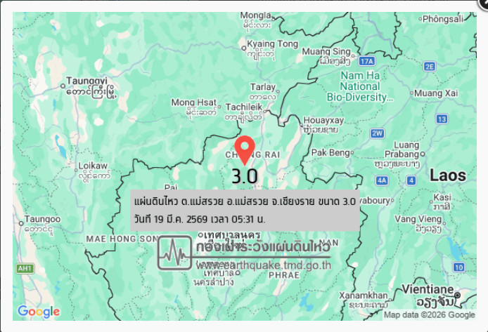 เมื่อเวลา 05.31 น. วันที่ 19 มีนาคม 2569 กองเฝ้าระวังแผ่นดินไหว กรมอุตุนิยมวิทยา รายงานตรวจพบแผ่นดินไหวขนาด 3.0 มีจุดศูนย์กลางอยู่บริเวณตำบลแม่สรวย อำเภอแม่สรวย จังหวัดเชียงราย พิกัด 19.713 องศาเหนือ 99.618 องศาตะวันออก ที่ความลึกเพียง 2 กิโลเมตร ซึ่งถือเป็นแผ่นดินไหวระดับตื้น ส่งผลให้ประชาชนในหลายพื้นที่ของจังหวัดเชียงรายรับรู้แรงสั่นสะเทือนได้อย่างชัดเจน โดยเฉพาะในอำเภอเมืองเชียงราย อำเภอพาน และอำเภอแม่ลาว