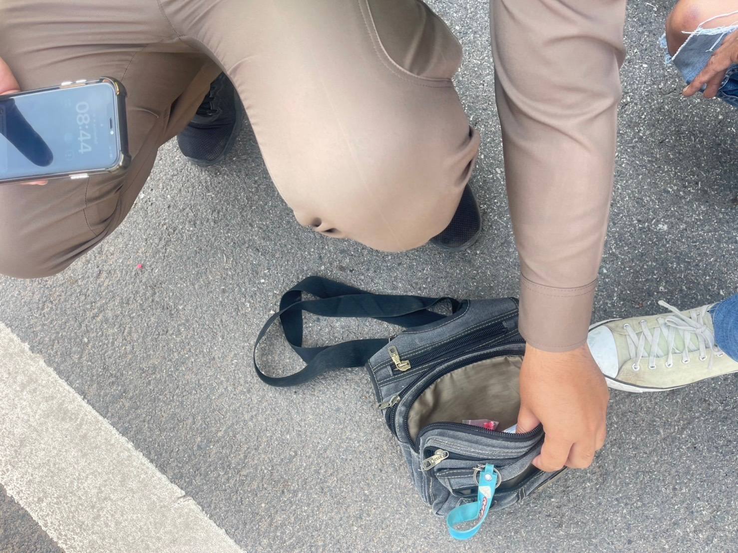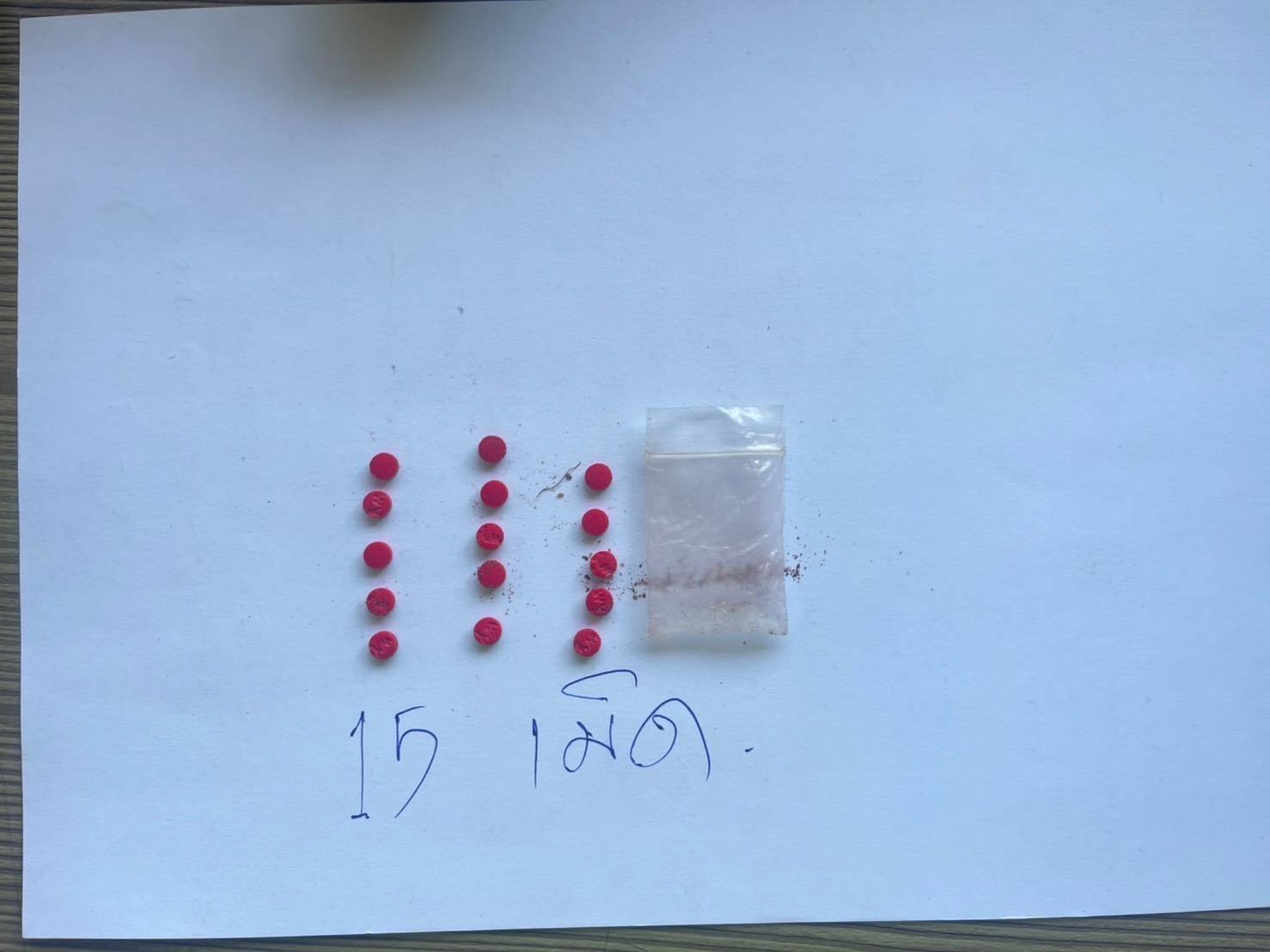 แต่ระหว่างนั้น เจ้าหน้าที่ได้กลิ่นคล้ายยาเสพติดติดอยู่ที่ใบขับขี่ จึงได้ขอทำการตรวจค้นกระเป๋าสะพายข้าง ปรากฎว่าพบยาบ้า 15 เม็ด อยู่ในกระเป๋าสะพาย