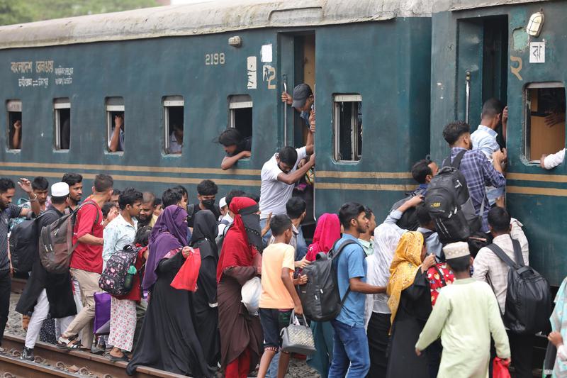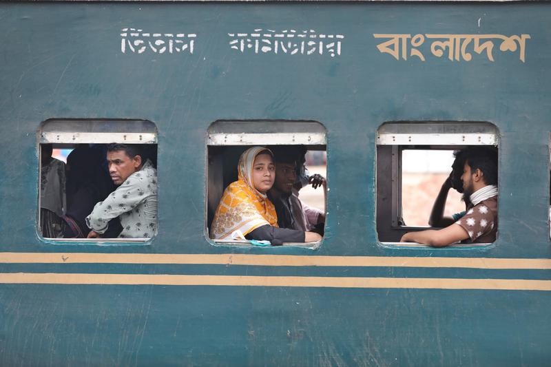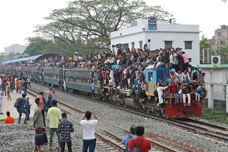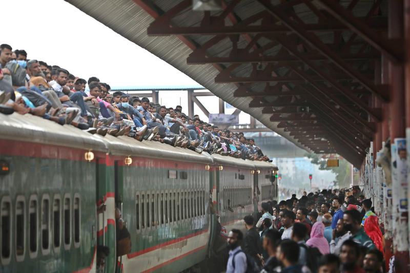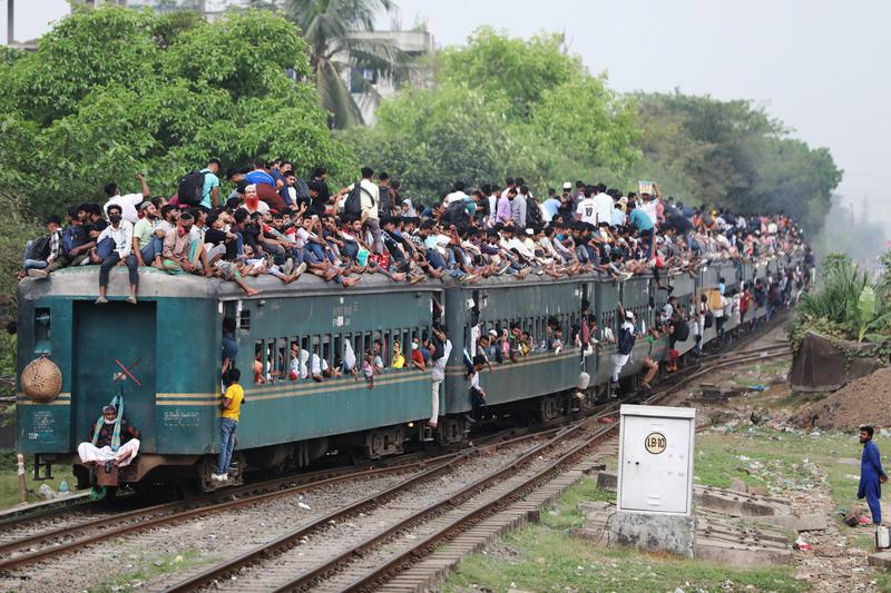 กาซิปูร์, 19 มี.ค. (ซินหัว) -- ประชาชนชาวบังกลาเทศแห่ขึ้นรถไฟโดยสารจนอัดแน่นล้นขบวน ขณะอีกจำนวนมากเลือกปีนขึ้นนั่งบนหลังคาตู้โดยสาร ห้อยโหนตามประตูหน้าต่างของตู้โดยสาร รวมถึงจับจองพื้นที่หัวท้ายขบวน กลายเป็นภาพการเดินทางชวนทึ่งที่ชานชาลาสถานีรถไฟตองกีในเมืองกาซิปูร์ของบังกลาเทศ ซึ่งรับรองผู้โดยสารจำนวนมหาศาลที่ต้องการเดินทางกลับภูมิลำเนาในยามใกล้วันอีดิลฟิตรี (Eid al-Fitr) ที่เป็นจุดสิ้นสุดการถือศีลอดตามเดือนรอมฎอน