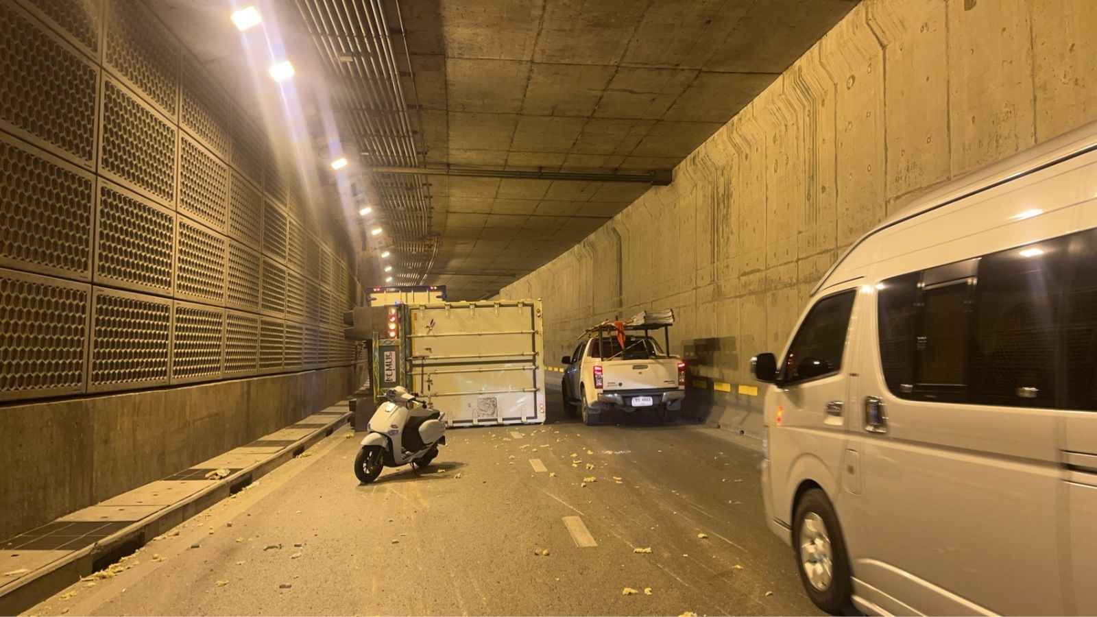 19 มี.ค. 69 เวลา 20.00 น. ถ.กรุงเทพกรีฑา ขาออก มุ่งหน้า ศรีนครินทร์-ร่มเกล้า ภายในอุโมงค์กรุงเทพกรีฑา รถบรรทุกพ่วงพลิกตะแคง ผ่านได้เลนขวา ท้ายสะสมถึงต่างระดับศรีกรีฑา