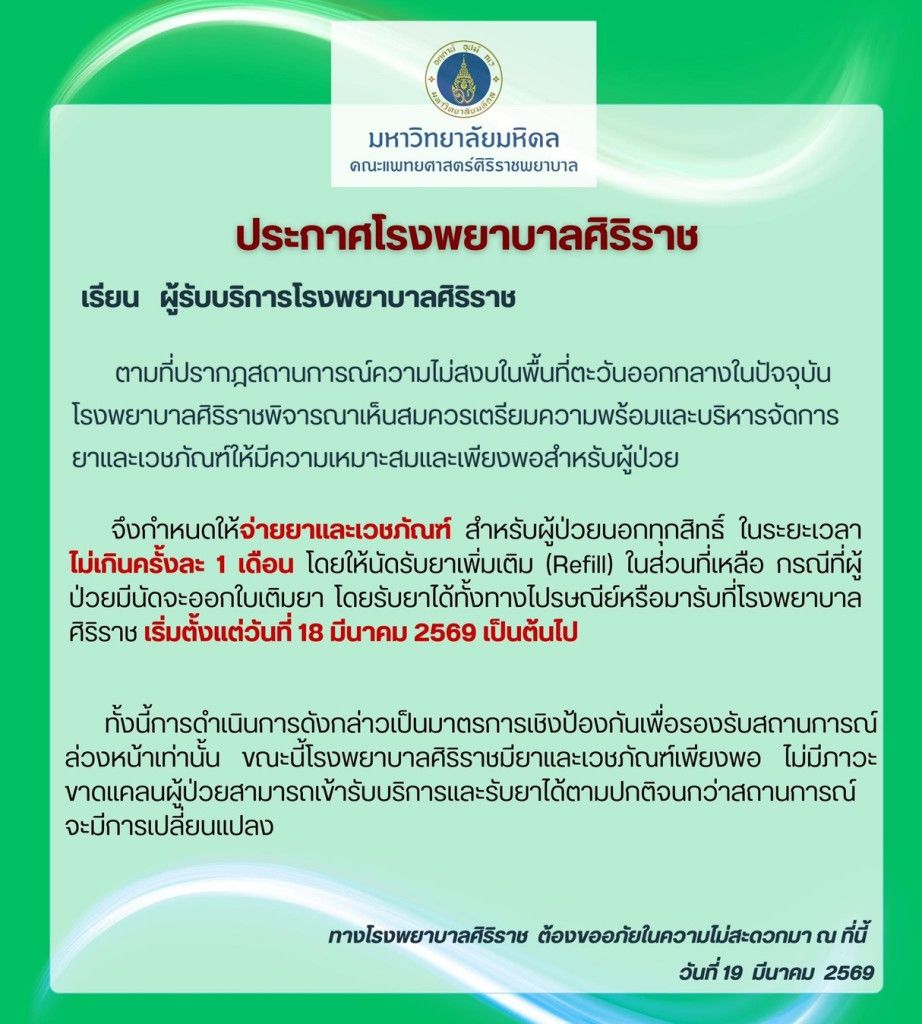 ทั้งนี้ การดําเนินการดังกล่าวเป็นมาตรการเชิงป้องกันเพื่อรองรับสถานการณ์ล่วงหน้าเท่านั้น ขณะนี้โรงพยาบาลศิริราชมียาและเวชภัณฑ์เพียงพอ ไม่มีภาวะขาดแคลน ผู้ป่วยสามารถเข้ารับบริการและรับยาได้ตามปกติจนกว่าสถานการณ์จะมีการเปลี่ยนแปลง