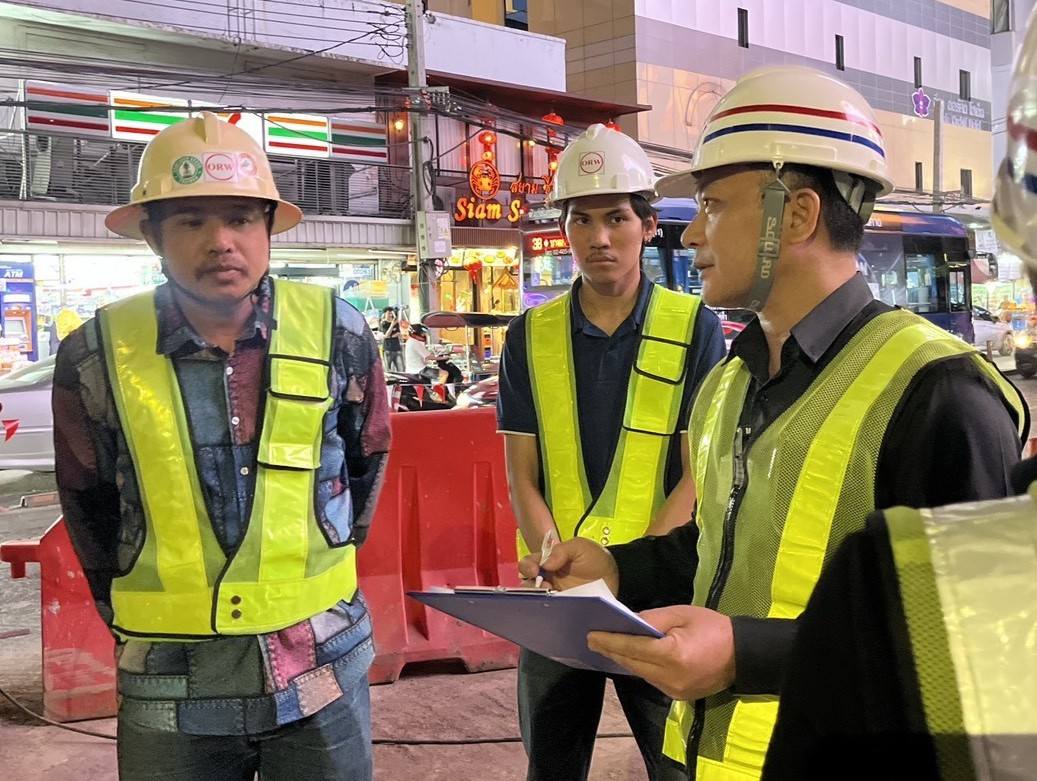 การรถไฟฟ้าขนส่งมวลชนแห่งประเทศไทย (รฟม.) โดยสำนักงานความปลอดภัย อาชีวอนามัยและสภาพแวดล้อมในการทำงาน (สปอ.) ลงพื้นที่ตรวจสอบการดำเนินงานด้านความปลอดภัยในการก่อสร้าง โครงการรถไฟฟ้าสายสีส้ม ช่วงบางขุนนนท์ – ศูนย์วัฒนธรรมแห่งประเทศไทย ช่วงเวลากลางคืน (Night Audit) โดยลงพื้นที่บริเวณสถานีอนุสาวรีย์ประชาธิปไตย สถานีหลานหลวง สถานียมราช สถานีราชเทวี สถานีประตูน้ำ และสถานีราชปรารภ โดยได้ตรวจสอบการติดตั้งแผงผ้าใบ ไฟส่องสว่าง ไฟสัญญาณเตือน และป้ายเตือนต่าง ๆ ตามแนวเขตก่อสร้าง ให้มั่นคงแข็งแรง อยู่ในตำแหน่งที่ปลอดภัย สามารถเห็นได้อย่างชัดเจน การเก็บวัสดุอุปกรณ์ที่ไม่ใช้แล้วให้เรียบร้อย การจัดวางแนวแบริเออร์ (Barriers) ให้เป็นระเบียบไม่ให้ล้ำเข้าพื้นผิวจราจร ซึ่งเป็นการป้องกันอุบัติเหตุที่อาจเกิดขึ้นจากการใช้ถนนในบริเวณดังกล่าว พร้อมกำชับให้เจ้าหน้าที่ทุกคนสวมใส่อุปกรณ์คุ้มครองความปลอดภัยส่วนบุคคลให้ครบถ้วนตลอดระยะเวลาที่ปฏิบัติงาน และปฏิบัติตามมาตรฐานความปลอดภัยที่กำหนดอย่างเคร่งครัด