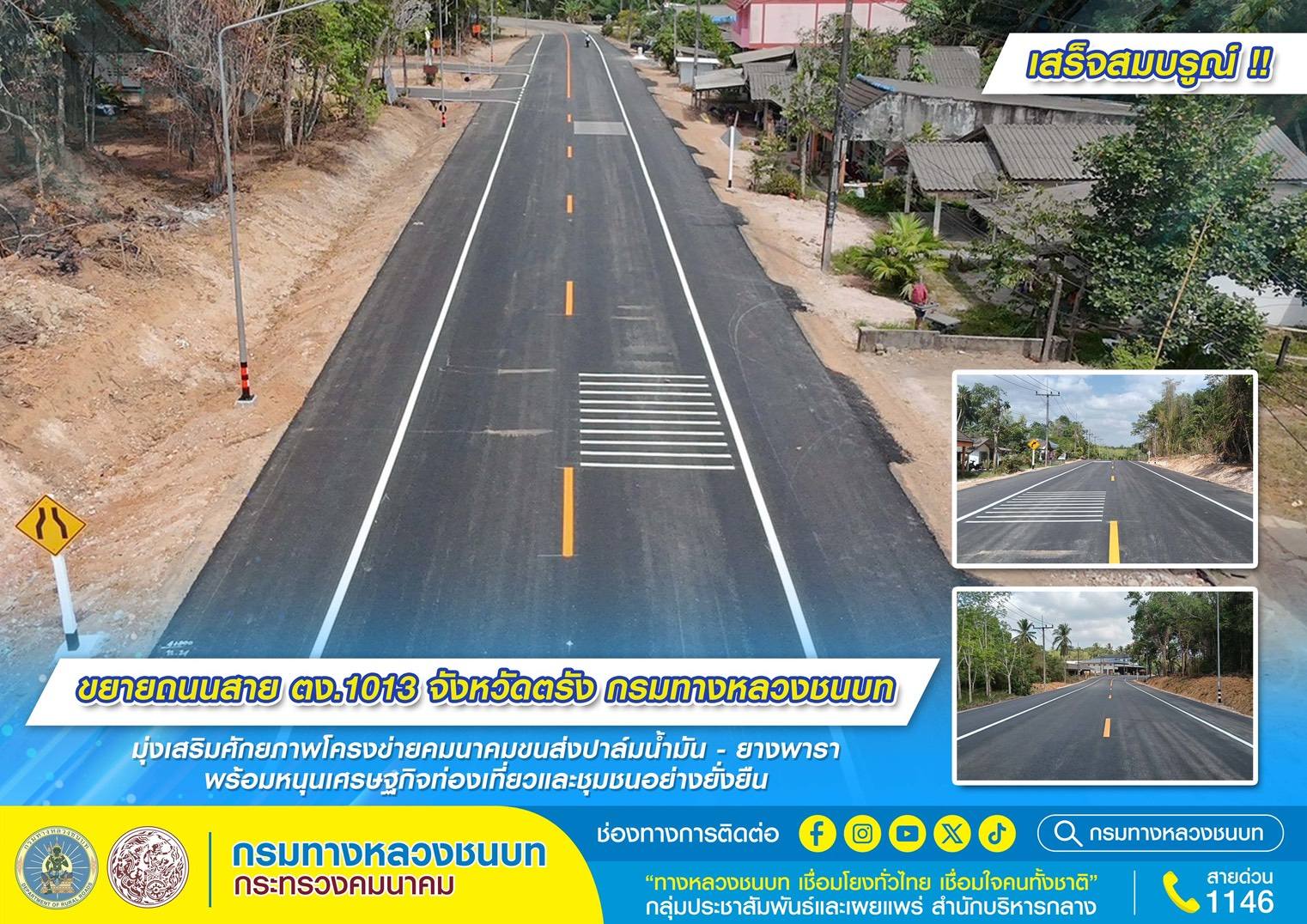 เสร็จแล้ว!! ขยายถนนสาย ตง.1013 จังหวัดตรัง กรมทางหลวงชนบท มุ่งเสริมศักยภาพโครงข่ายคมนาคมขนส่งปาล์มน้ำมัน - ยางพารา พร้อมหนุนเศรษฐกิจท่องเที่ยวและชุมชนอย่างยั่งยืน