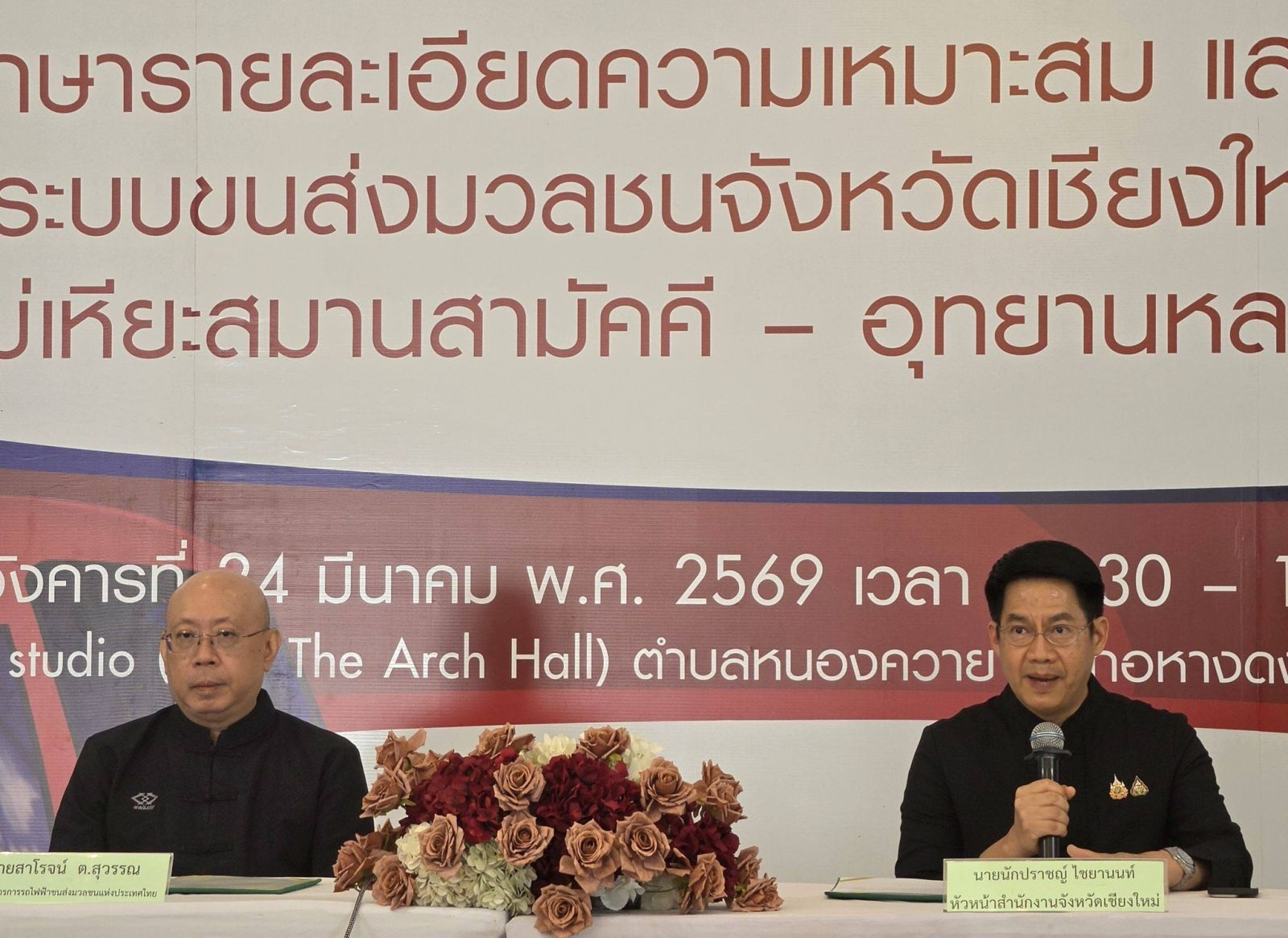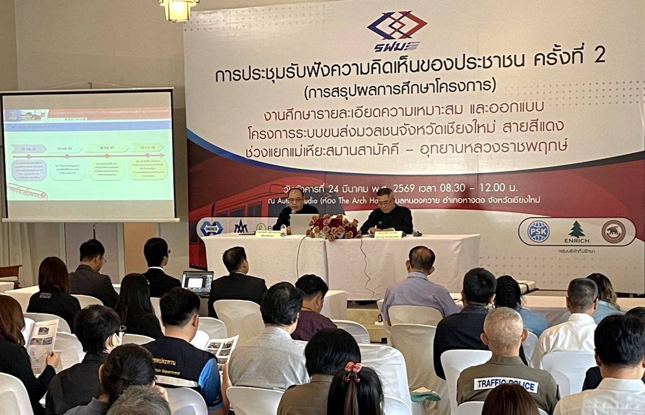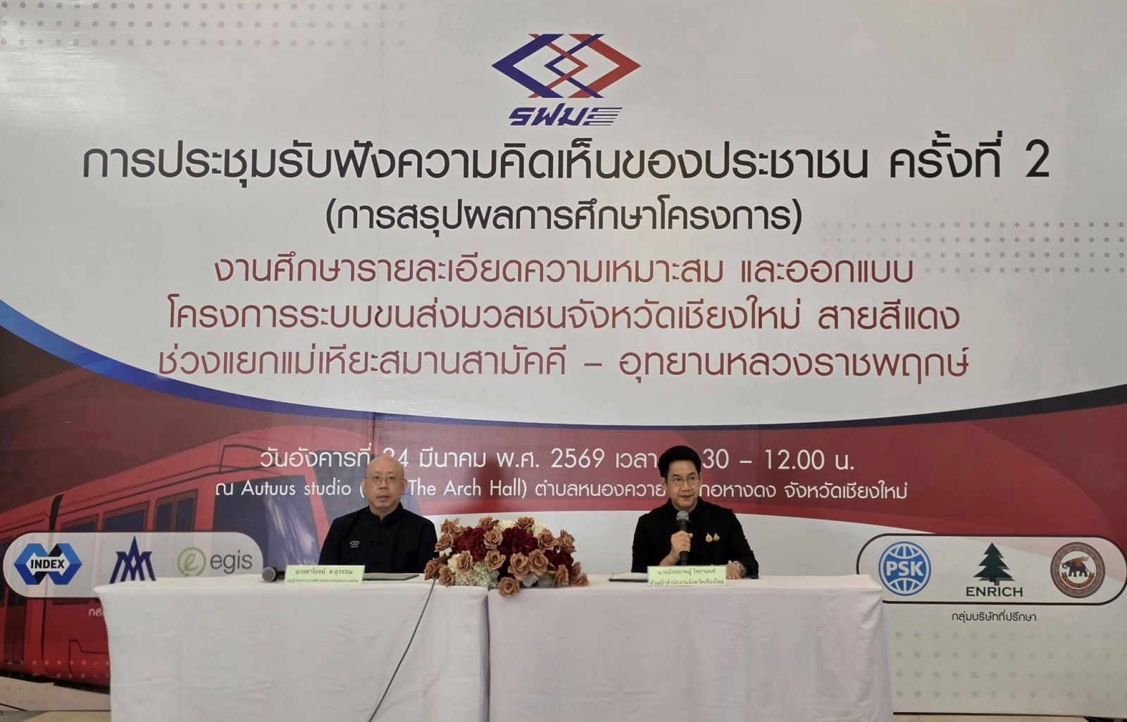 วันนี้ (24 มีนาคม 2569) นายสาโรจน์ ต.สุวรรณ รองผู้ว่าการ (กลยุทธ์และแผน) การรถไฟฟ้าขนส่งมวลชนแห่งประเทศไทย (รฟม.) และนายนักปราชญ์ ไชยานนท์ หัวหน้าสำนักงานจังหวัดเชียงใหม่ ผู้แทนผู้ว่าราชการจังหวัดเชียงใหม่ ร่วมเป็นประธานในการประชุมรับฟังความคิดเห็นของประชาชน ครั้งที่ 2 (สรุปผลการศึกษาโครงการ) งานศึกษารายละเอียดความเหมาะสม และออกแบบโครงการระบบขนส่งมวลชนจังหวัดเชียงใหม่ สายสีแดง ช่วงแยกแม่เหียะสมานสามัคคี - อุทยานหลวงราชพฤกษ์
