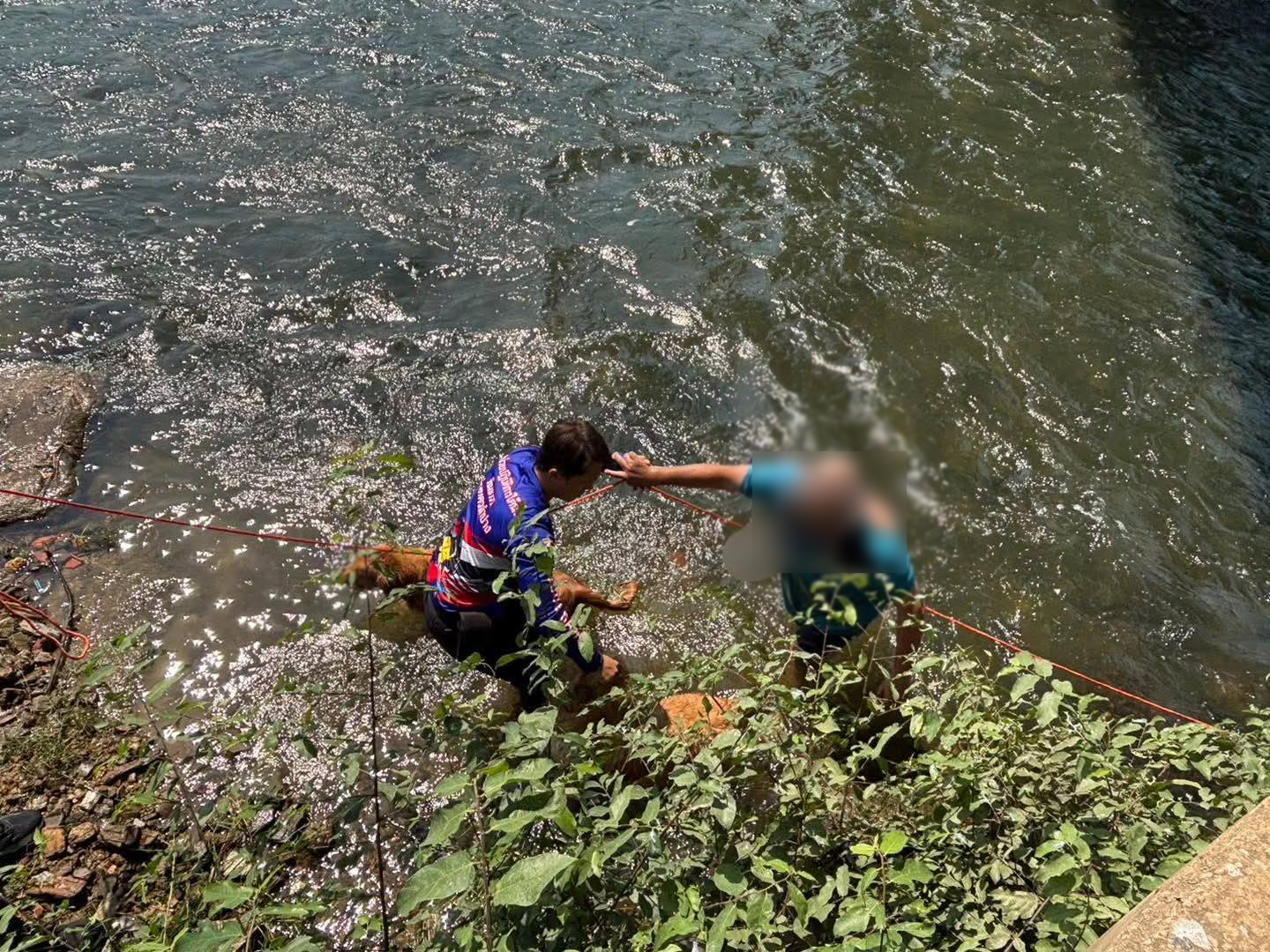 เมื่อไปถึงจุดเกิดเหตุ พบชายคนดังกล่าวติดอยู่บริเวณริมตลิ่ง ไม่สามารถขึ้นมาได้ พร้อมสุนัขสีน้ำตาล 1 ตัว เจ้าหน้าที่จึงเร่งใช้อุปกรณ์เชือกโรยตัวลงไปช่วยเหลืออย่างเร่งด่วน