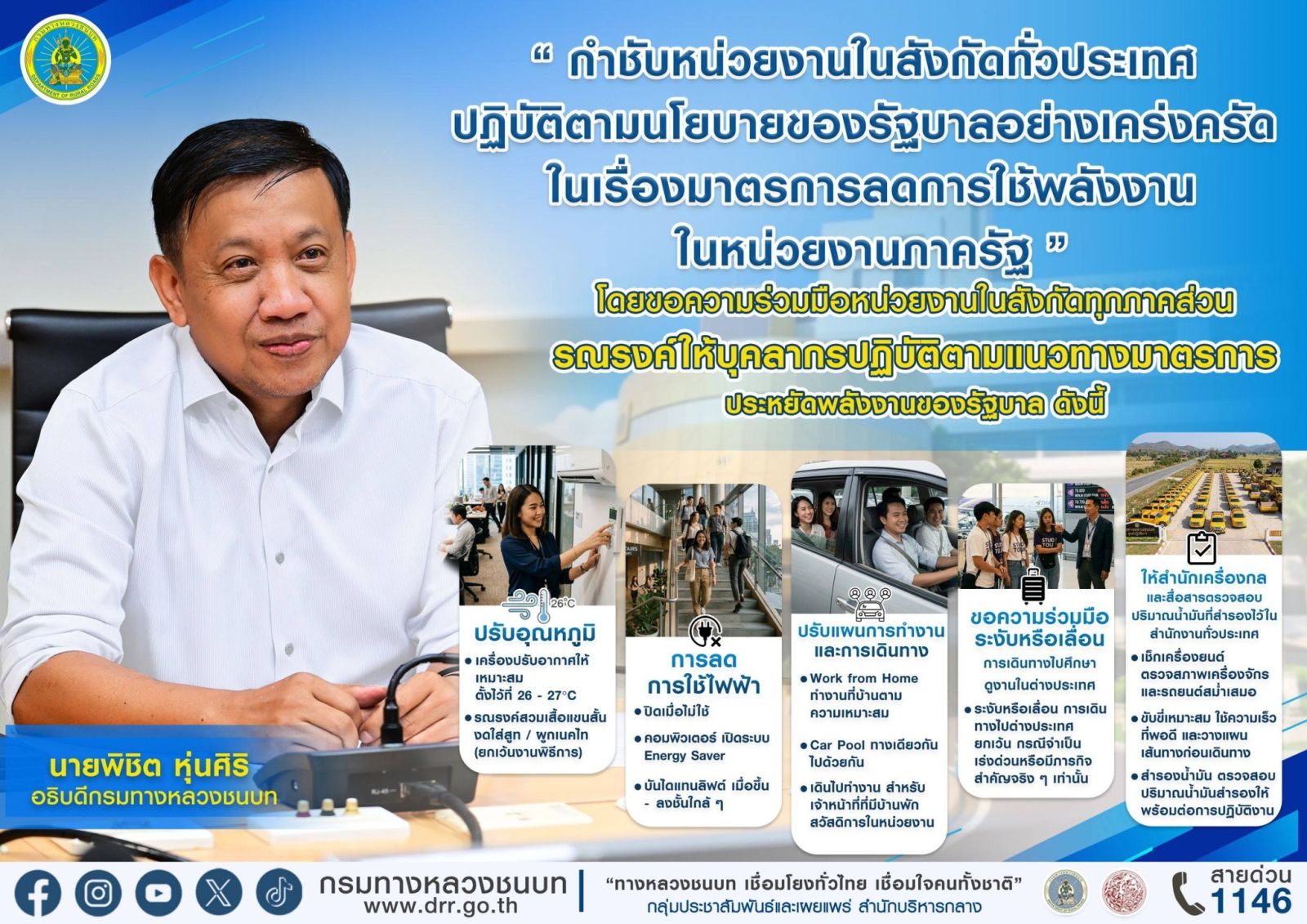 นายพิชิต หุ่นศิริ อธิบดีกรมทางหลวงชนบท มอบนโยบายในที่ประชุมผู้บริหารระดับสูงกรมทางหลวงชนบท ประจำเดือนมีนาคม ครั้งที่ 3/2569 ณ สำนักงานทางหลวงชนบทที่ 5 (นครราชสีมา) เมื่อวันที่ 16 มีนาคม 2569 โดยได้กำชับให้หน่วยงานในสังกัดทั่วประเทศ ประกอบด้วย สำนักงานทางหลวงชนบทที่ 1 - 18 แขวงทางหลวงชนบท 76 จังหวัด และหมวดบำรุงทางหลวงชนบท ให้ปฏิบัติตามแนวทางของรัฐบาลอย่างเคร่งครัดในเรื่องมาตรการลดการใช้พลังงานในหน่วยงานภาครัฐ เนื่องจากสถานการณ์ความตึงเครียดทางภูมิรัฐศาสตร์ในภาคตะวันออกกลาง ซึ่งเป็นแหล่งผลิตและขนส่งพลังงานที่สำคัญของโลก รัฐบาลจึงได้ให้ความสำคัญในการบริหารจัดการพลังงานของประเทศอย่างเข้มข้น ทั้งนี้ ในส่วนของกรมทางหลวงชนบท (ทช.) ขอร่วมเป็นส่วนหนึ่งในการฝ่าวิกฤตครั้งนี้ เพื่อรองรับสถานการณ์พลังงานโลกที่มีความผันผวนอย่างต่อเนื่อง โดยขอความร่วมมือหน่วยงานในสังกัดทุกภาคส่วน รณรงค์ให้บุคลากรปฏิบัติตามแนวทางมาตรการประหยัดพลังงานของรัฐบาล ดังนี้