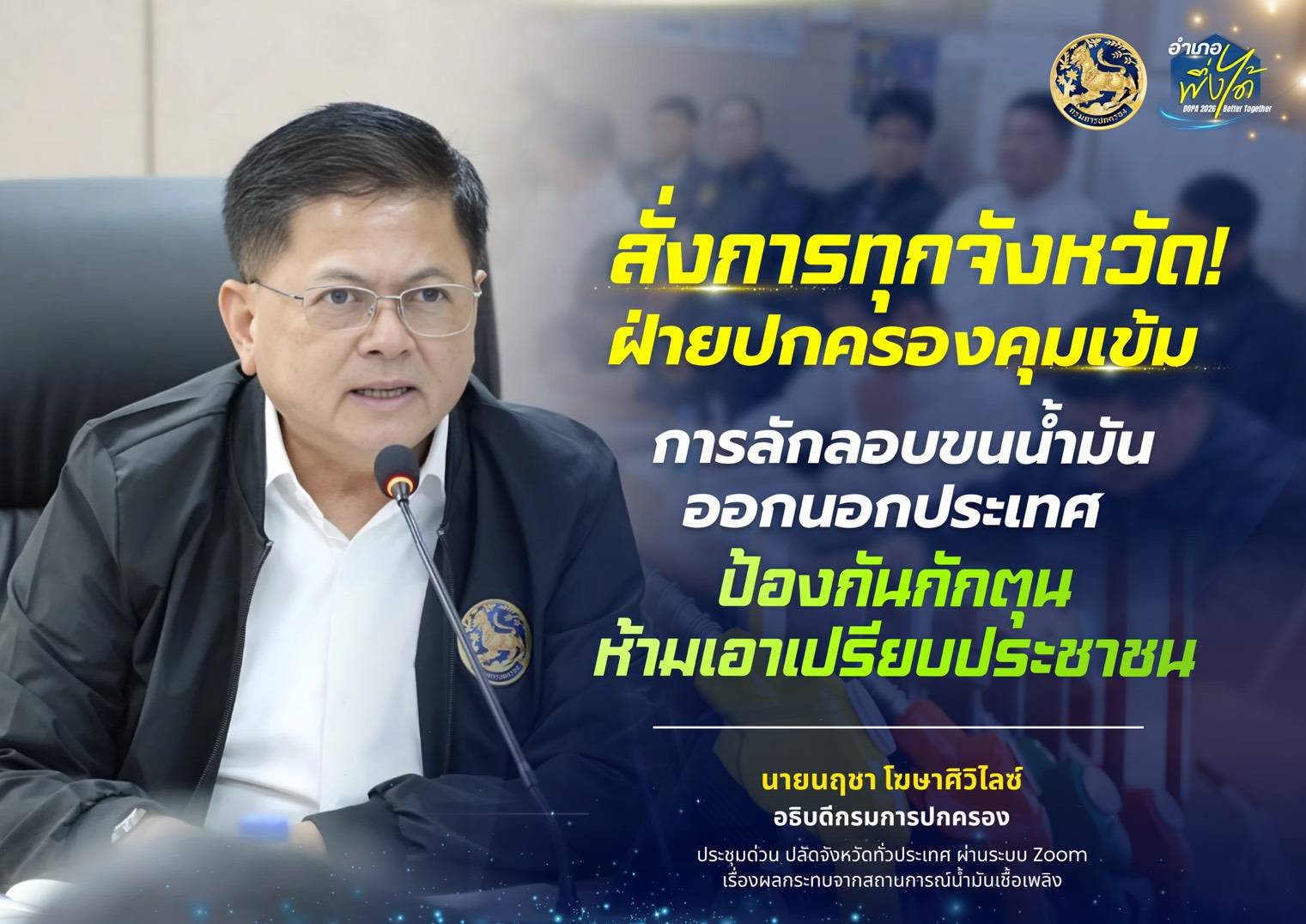 อธิบดีกรมการปกครอง สั่งการด่วนทุกจังหวัด! คุมเข้มการลักลอบน้ำมันออกนอกประเทศ ป้องกันกักตุน-เอาเปรียบประชาชน ย้ำ..นายอำเภอ เร่งสร้างการรับรู้สถานการณ์น้ำมันในวันนี้!!