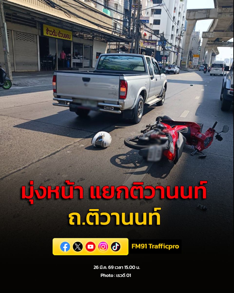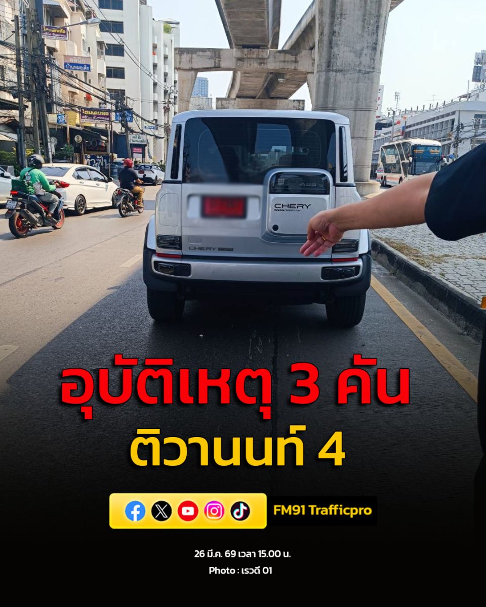 26 มี.ค. 69 เวลา 15.50 น. ถ.ติวานนท์ ขาเข้า ปากซอยติวานนท์ 4 (ก่อนถึงแยกติวานนท์) รถชนกัน 3 คัน มีผู้เสียชีวิต 1 ราย ท้ายสะสมปากซอยทานสัมฤทธิ์