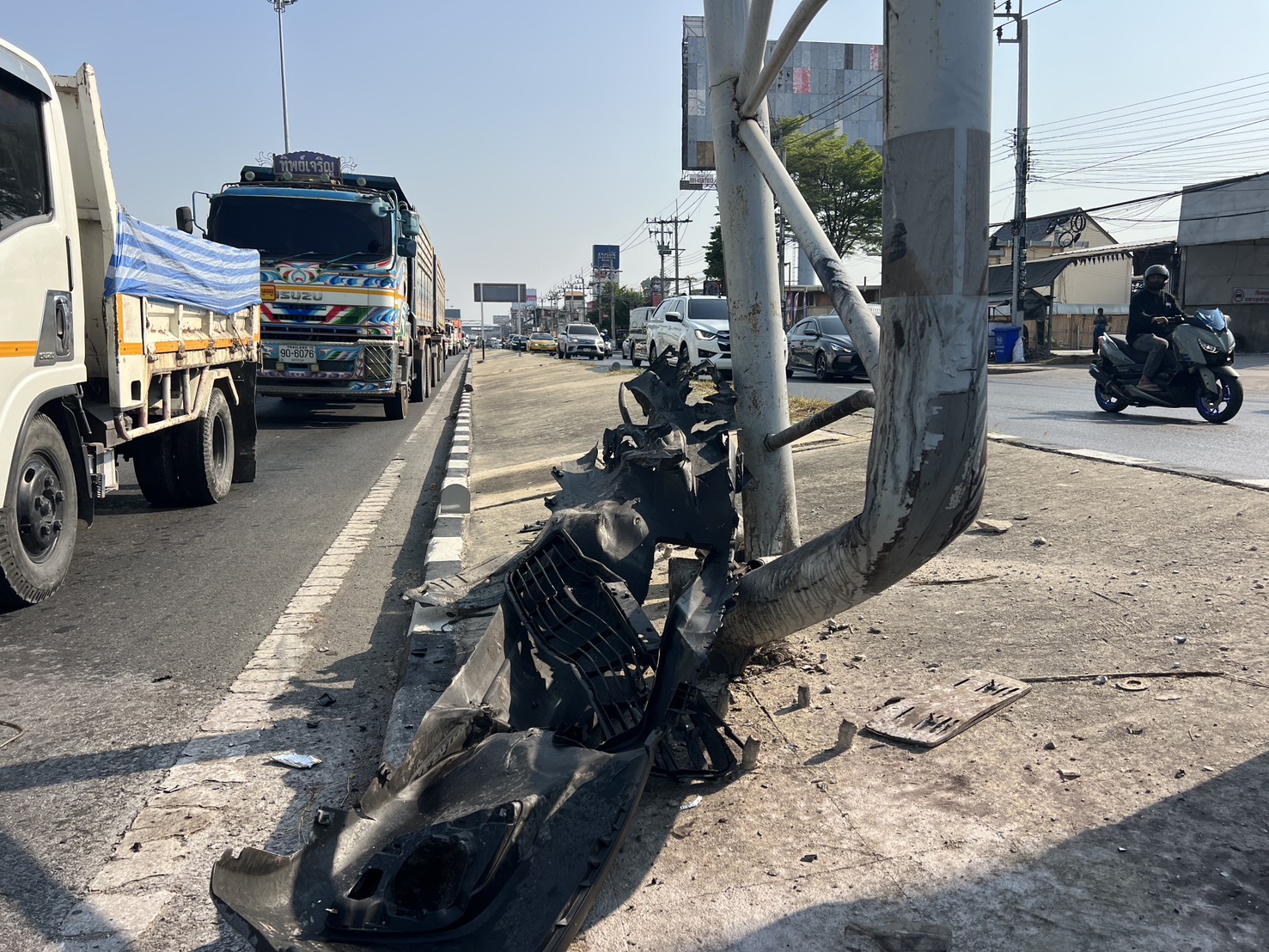 นนทบุรี-วินาทีกระบะชนเสา รถจยย.ชนซ้ำ และรถบรรทุก 6 ล้อตามหลังทับซ้ำดับสยอง
