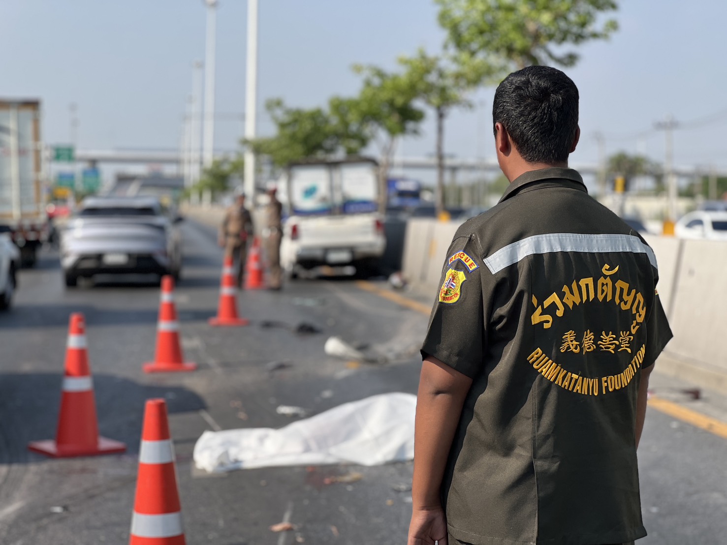เหตุเกิด ถ.ราชพฤกษ์ ขาออก ก่อนถึงต่างระดับสาลีโข 800 เมตร ต.บางพลับ อ.ปากเกร็ด จ.นนทบุรี จากนั้นจึงประสานแพทย์เวรจากสถาบันนิติวิทยาศาสตร์ร่วมตรวจสอบ