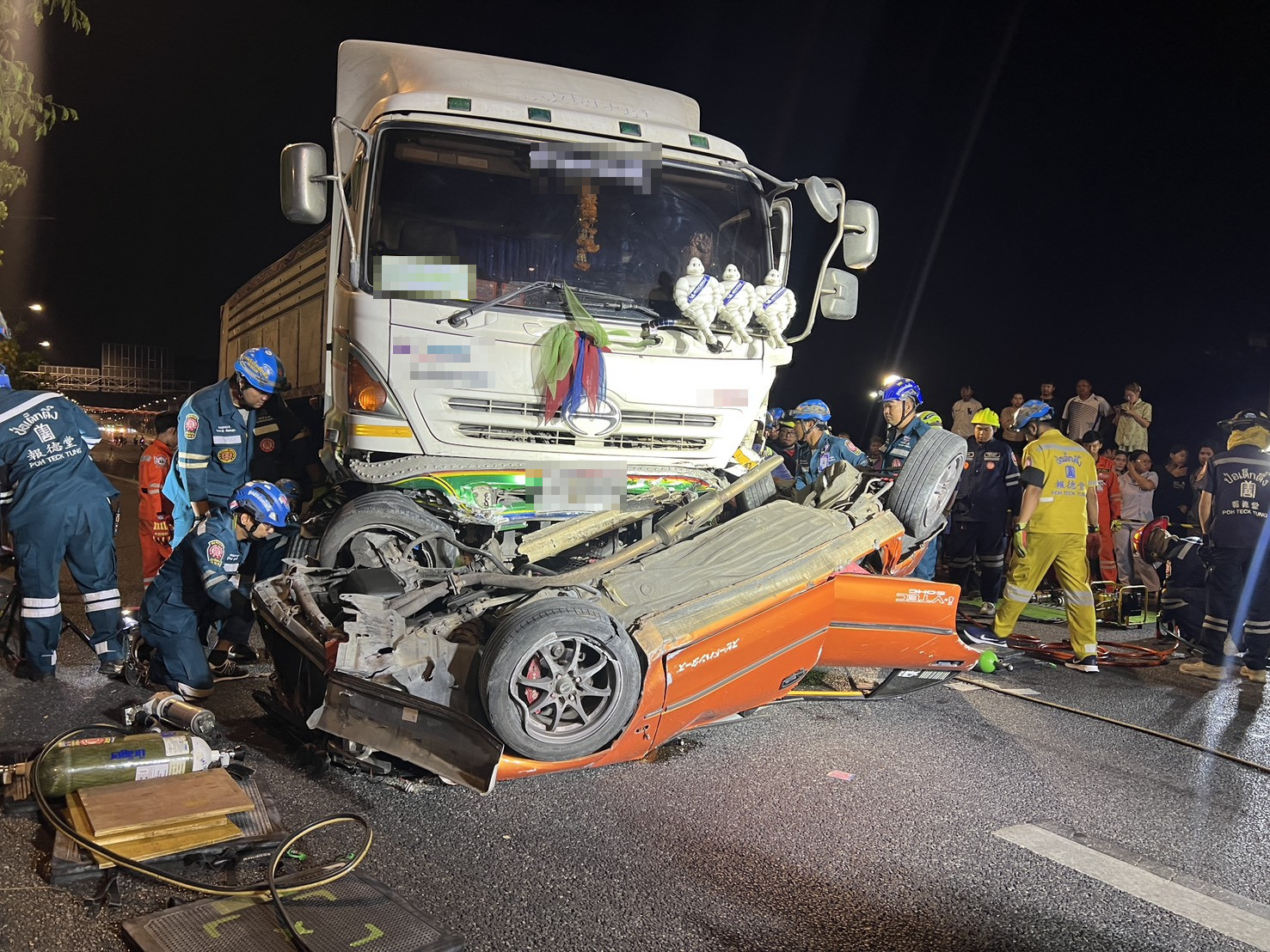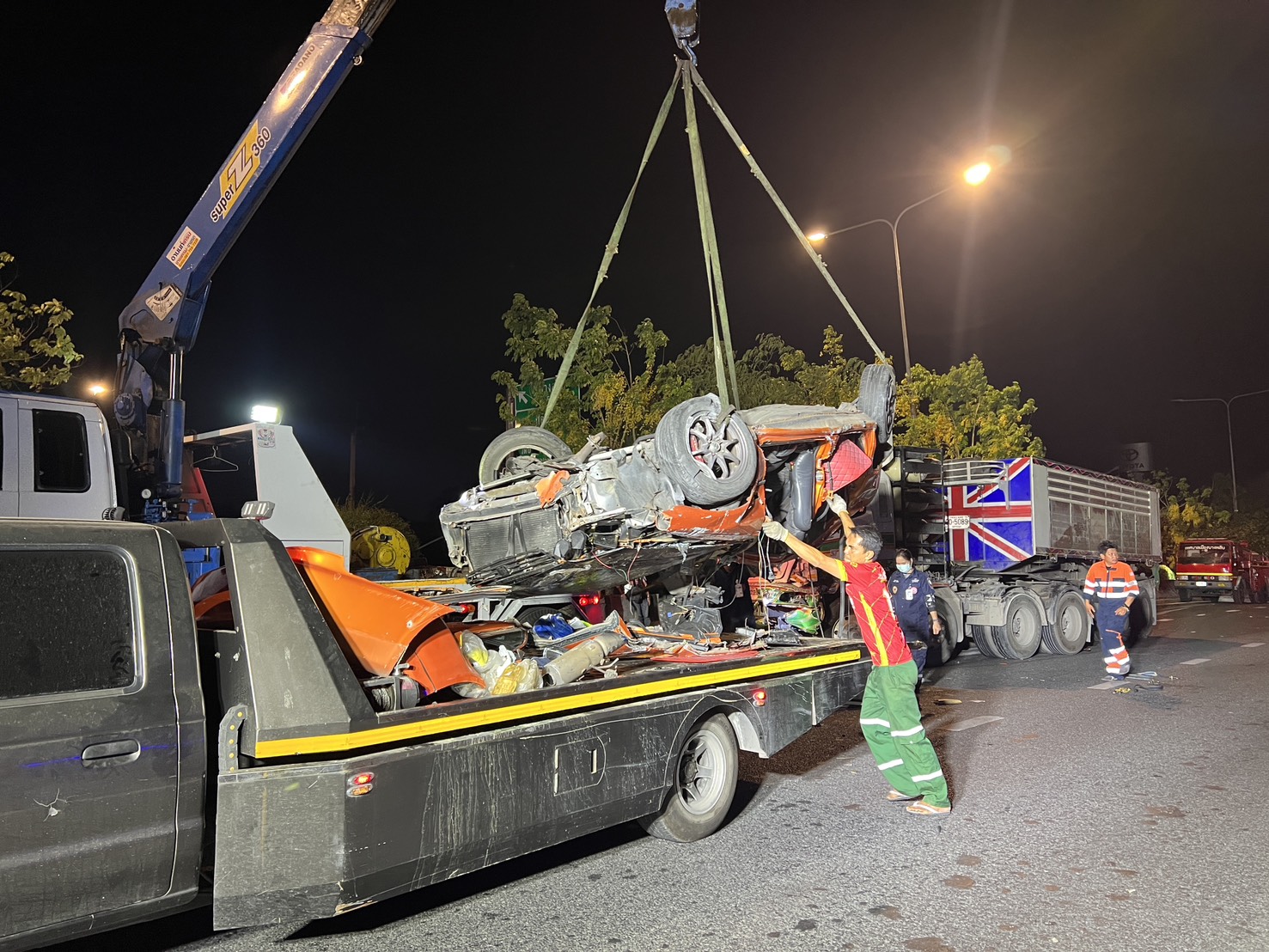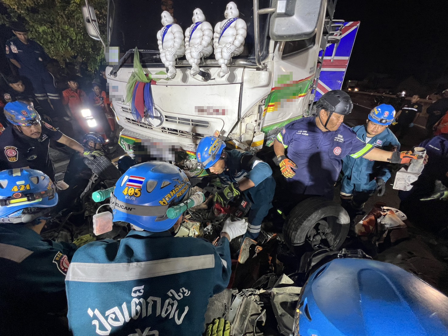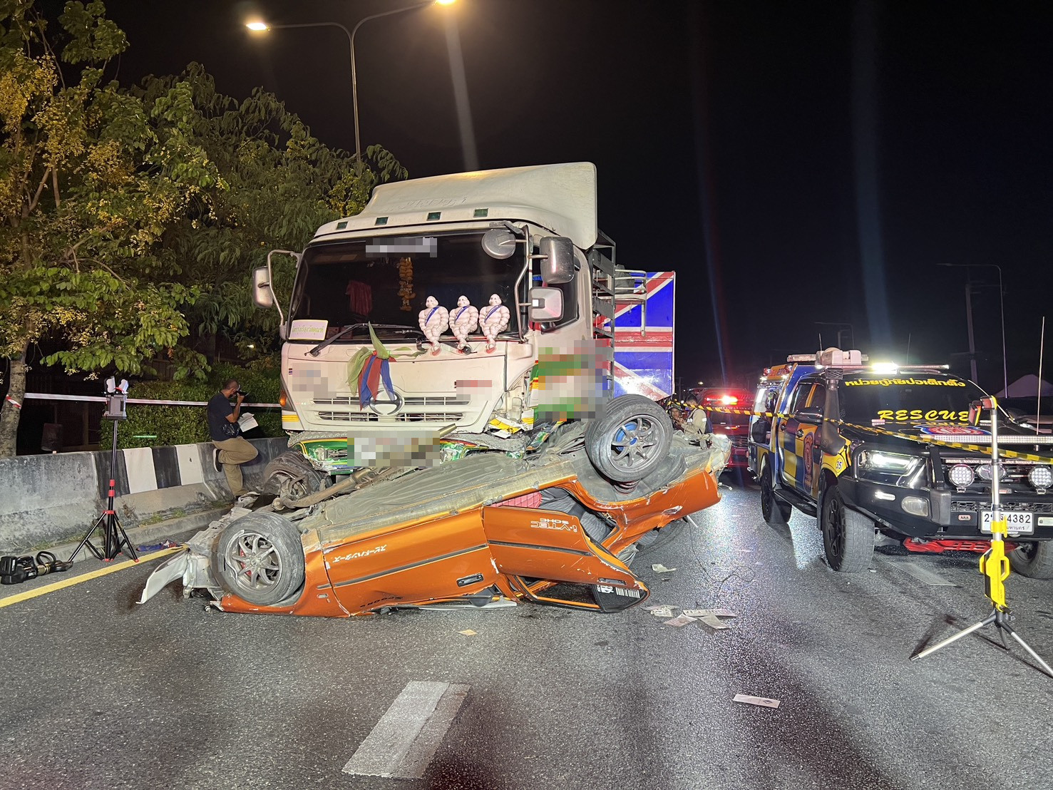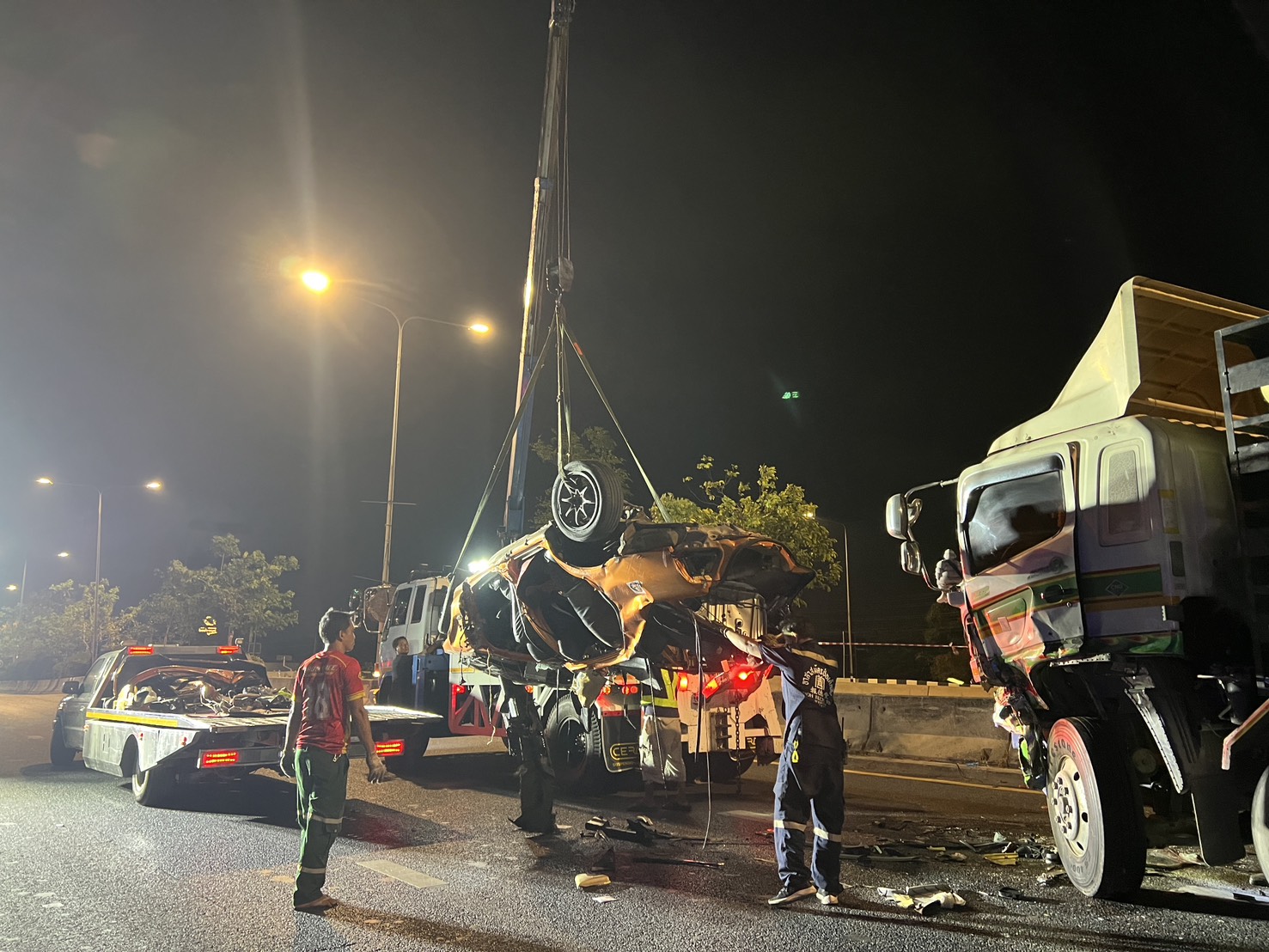 เก๋งพุ่งข้ามเกาะกลางถนน ประสานงารถบรรทุกพ่วงติดคาซากรถ ดับ 2 ศพ